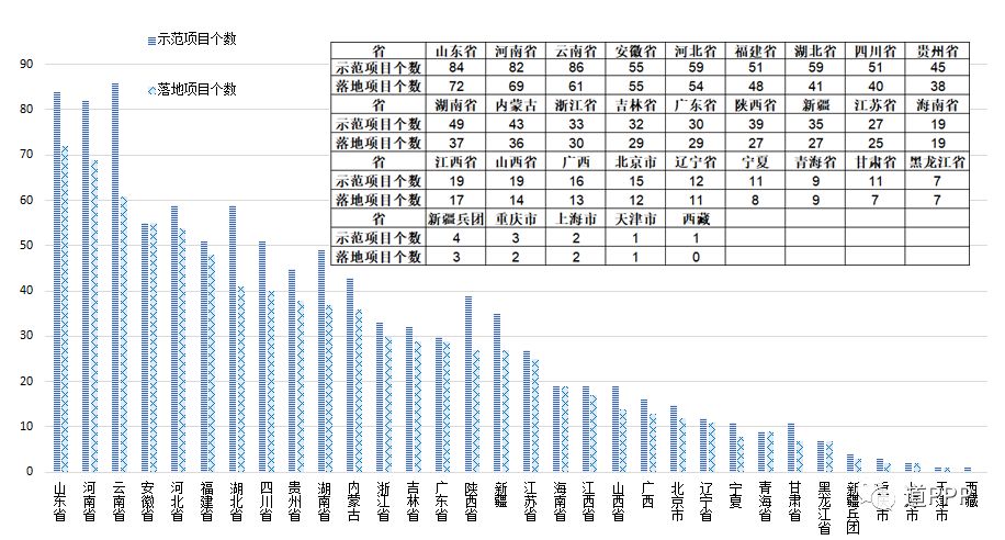 按各地落地示范项目数统计,山东(含青岛)已有72个示范项目签约进入执行阶段,居全国第一;其后河南69个、云南61个、安徽55个、河北54个、福建48个、湖北41个、四川40个。其余各省均不足40个,上述8省份合计占落地示范项目总数的52.2%。各地示范项目数与落地数对比如图2-4。