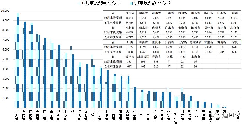 一季度各地新增项目数前三位是安徽、河南、浙江,分别为97个、88个、57个,合计占管理库新增项目总数的85.2%;一季度新增投资额前三位是贵州、安徽、广东,分别为1,297亿元、1,194亿元和1,116亿元,合计占管理库新增总投资额的48.2%,如图3-2-1和3-2-2。