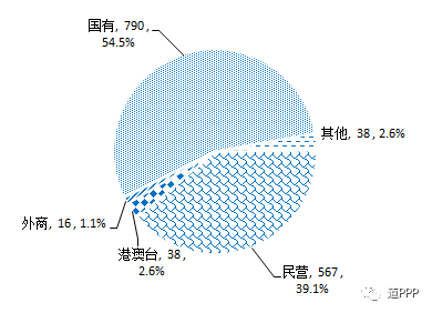 社会资本合作方类型。截至3月末,843个落地示范项目中包括442个独家社会资本项目和401个联合体项目。签约社会资本共1,449家,包括民营567家、港澳台38家、外商16家、国有790家,另外还有类型不易辨别的其他38家。如图2-5-1,民营企业占比39.1%,环比上升0.2个百分点。