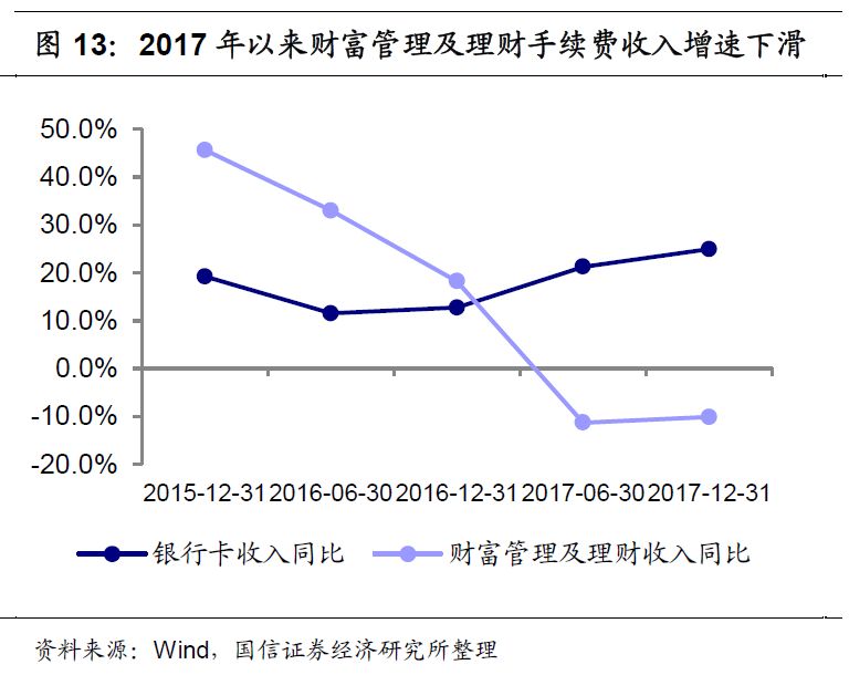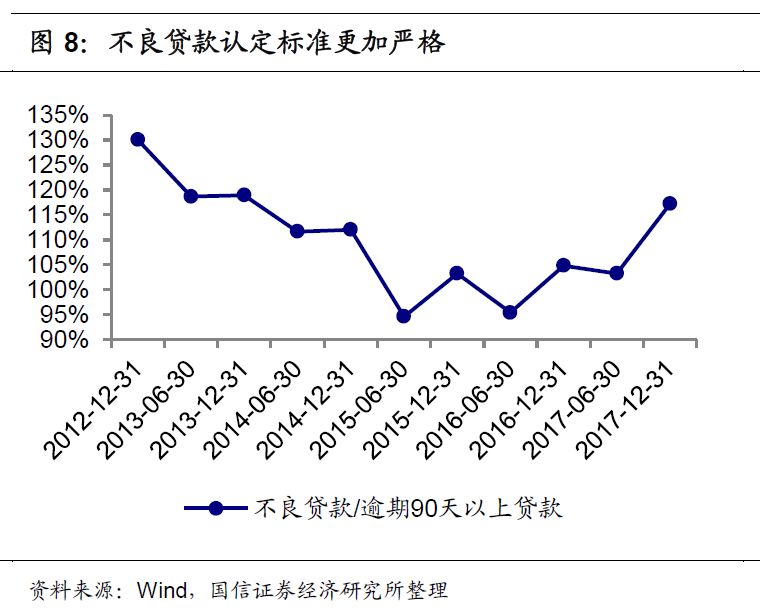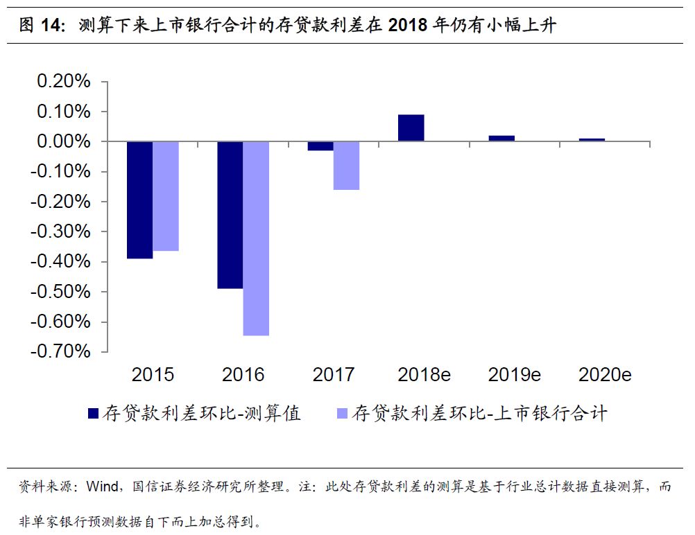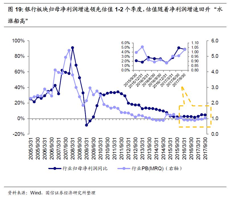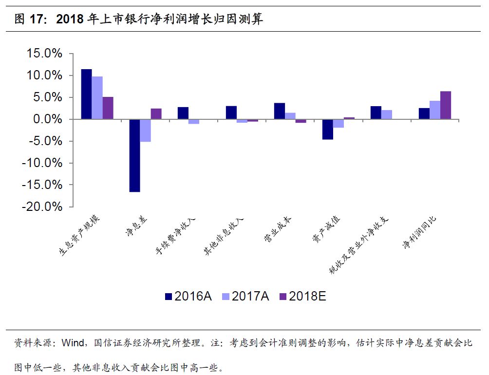 目 录 一、业绩回顾与分析:净利润增速继续回升 1.驱动因素之净息差:如期回升 2.驱动因素之资产质量:持续改善 3.驱动因素之资产规模:增速回落 4.其他因素:部分业务拖累手续费净收入 二、展望:预计2018年行业整体盈利增速回升至6-7% 三、投资建议:估值有望“水涨船高”,个股推荐“哑铃组合” 四、风险提示 五、附录(会计准则变动的影响分析) 以下为 报告正文 一、业绩回顾与分析:净利润增速继续回升 从刚刚披露的上市银行2017年报和2018一季报数据来看,行业净利润增速继续回升,显示出向上的行业景气度。上市银行整体(指16家老上市银行合计,下同)2017年净利润同比增长4.2%,归母净利润同比增长4.6%;2018年一季度净利润同比增长5.2%,归母净利润同比增长5.3%,增速回升。 从归因分析来看,净利润增速回升主要依靠净息差同比改善,其次是资产质量改善带来的资产减值损失计提减少。拖累净利润增速的不利因素是规模增速回落,以及严监管、降成本等因素导致的手续费净收入增速回落等。 1. 驱动因素之净息差:如期回升 2017年后三季度净息差如期回升。从单季净息差来看,由于负债端重定价早于资产端,2016年底开始市场利率突然显著上升导致银行负债成本快速上行(主要是指批发负债业务的成本,而存款成本上升不明显,部分存款优异的银行其成本还在2017年初因重定价因素而下降),再叠加2017年初部分资产仍有重定价因素(2015-2016年降息影响的延续),使得银行的净息差明显回落,在2017年一季度达到低点。后来随着负债成本基本走平,而资产端陆续到期重定价,净息差逐季回升,到2017年四季度时已经回升到2016年三季度水平。 可比口径调整后2018年一季度净息差继续回升。2018年一季度用期初期末平均余额算出的上市银行整体净息差下降较多,但并非真的回落,而是部分银行会计准则调整,导致一季度净息差与历史不可比。口径还原之后,一季度单季净息差环比约上升1bp至2.04%(相关会计准则调整的影响及还原算法请见附录),继续小幅上升,符合我们前期预期。 2. 驱动因素之资产质量:持续改善 2017年和2018年一季度上市银行整体资产质量持续改善,主要观察指标均企稳好转: (1)上市银行整体不良贷款率和不良生成率持续回落。其中2018年一季度加回核销转出后的单季年化不良生成率(剔除IFRS9影响)0.77%,较去年同期回落3bps; (2)前瞻性指标上,关注贷款率和逾期贷款率从2016下半年以来均持续回落; (3) 反映不良认定标准严格程度的“不良贷款/逾期90天以上贷款”在2017年大幅上升了12个百分点至117%,不良认定的严格程度显著提升; (4)在拨备前利润快速增长且资产质量改善的情况下,部分银行加大了拨备计提力度以平滑净利润增速。2016年以来当期计提拨备/当期新生成不良贷款持续回升,2017年达到131%,反映出银行重新开始大量计提超额拨备。 3. 驱动因素之资产规模:增速回落 2017年以来,受金融严监管措施影响,银行资产增速快速回落,上市银行整体资产增速在2018年一季末降至5.4%,比2016年末降低了7.6个百分点,也低于2017年末水平。 值得注意的是,资产增速的回落伴随着资产端的结构优化:从生息资产结构来看,贷款占比持续提升。从2016年末到2018年一季末,贷款/生息资产提升了2.8个百分点,行业实现“回归本源”。而非标、同业等非信贷资产,在各类监管措施的压力下,余额开始逐步压缩。部分中小银行此前非标等资产占比过高,甚至面临较大的缩表压力,个别银行已出现明显缩表。缩表长期看自然有利于结构优化,但短期内也难免影响营业收入。 4. 其他因素:部分业务拖累手续费净收入 2017年及2018年一季度手续费净收入同比均为负增长,拖累盈利增速。手续费核心收入来源是两大类(其他来源比较分散):一是银行卡(大部分是信用卡分期手续费),二是财富管理及理财手续费(包括理财、代理、受托三项)。2017年以来不少银行加大零售业务投入,银行卡业务收入同比快速增长;但受资管监管加强影响,再加上资本市场表现不理想,财富管理及理财业务收入增速快速下降。此外,有关部委继续推进银行业“减费让利”,也对手续费净收入有一定负面影响。 二、展望: 预计2018年行业整体盈利增速回升至6-7% 我们预计2018年上市银行整体净利润增速仍将回升,主要基于如下判断: (1)资产规模增速下行空间减小。2017年末上市银行整体总资产同比增速仅有6.1%,已经比2016年末减少了6.9个百分点,2018年增速进一步下降的空间显然已经很小(但部分中小银行非标、同业资产仍然较高,可能继续受监管影响); (2)重定价叠加信贷议价能力增强,净息差同比回升。净息差的测算难度比较大,主要是因为非存贷款业务的利率与市场利率相关,波动很大,引起较大误差。但是从历史数据来看,由于存贷款业务仍然是主体,净息差变动方向跟存贷款利差基本一致,未来业务回归本源之后将更趋一致。在未来基准利率维持不变的假设下,测算2018年存贷款利差较2017年走阔。此外,受到严监管影响,银行信贷业务议价能力增强,2018年存贷款利差改善幅度或超过测算值。净息差回升将对净利润的同比增长带来较大正面贡献; (3) 资产质量稳定,存量拨备厚实。目前工业企业偿债能力仍然处于高位,银行资产质量保持稳健,新发生不良的压力不大。在监管层加大检查力度的情况下,不排除部分银行隐藏的不良资产将会暴露,成为2018年