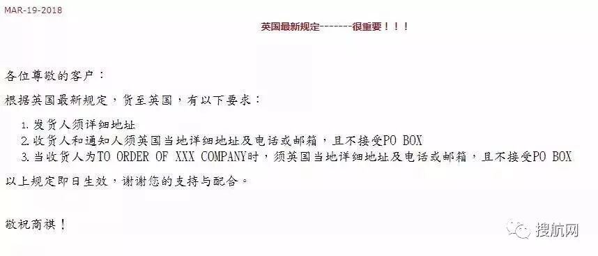来源:搜航网英国海关最新规定!近日,英国发布最新规定,货至英国,有以下要求。请所有的货主、货代们注意:1. 发货人须详细地址;2. 收货人和