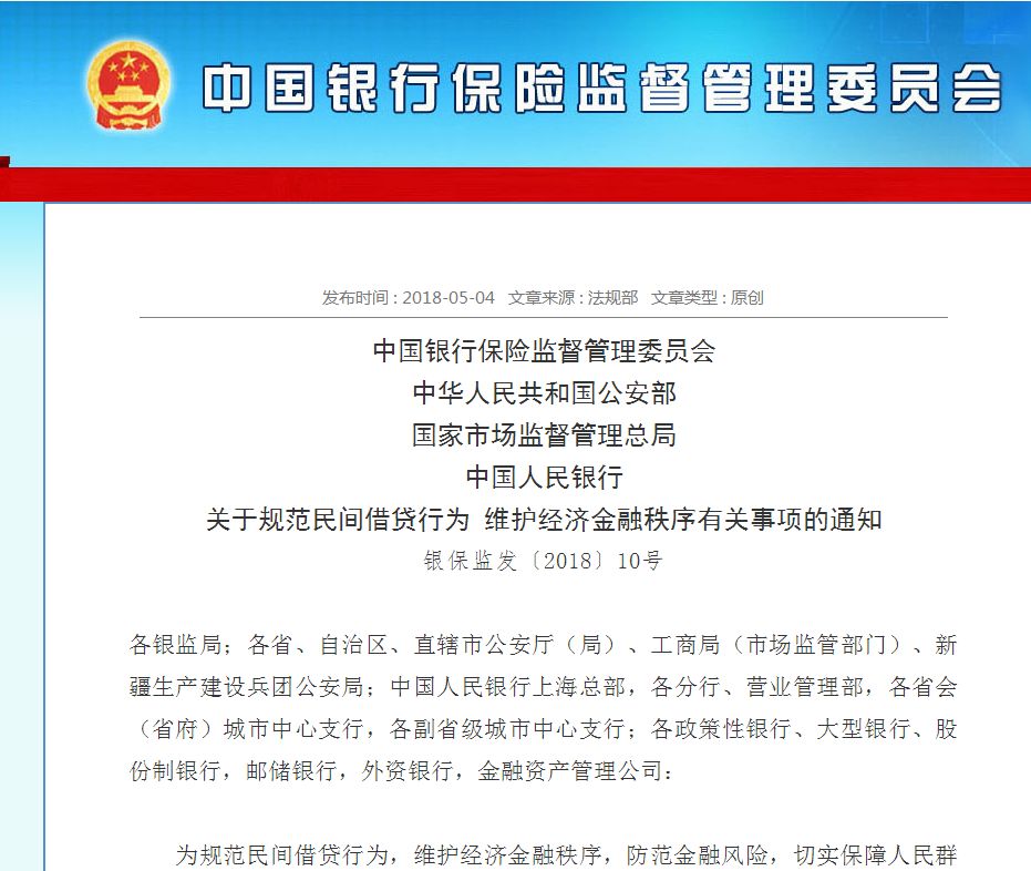 银保监会5月4日发布《关于规范民间借贷行为 维护经济金融秩序有关事项的通知》