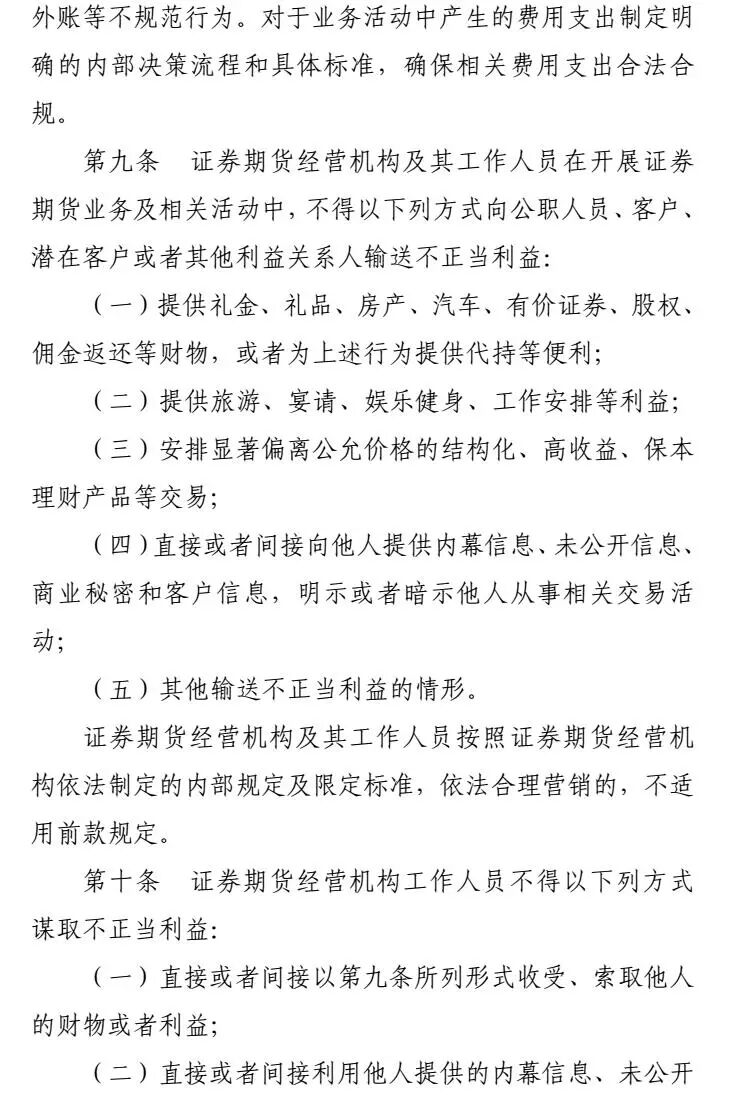 1、(第九条)证券期货经营机构及其工作人员在开展业务时,不得向公职人员、客户、潜在客户或其他利益关系人输送不正当利益,包括了提供礼金、礼品、房产、汽车、有价证券、股权、佣金返还等财物,提供旅游、宴请、娱乐健身、工作安排等利益等五项内容。