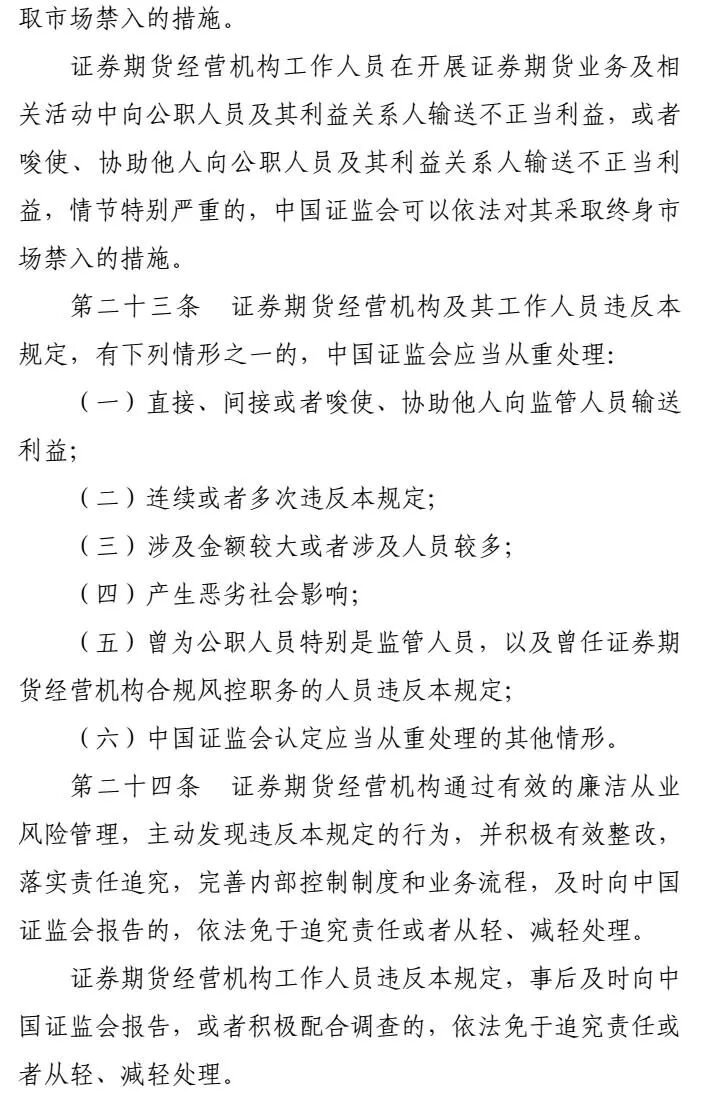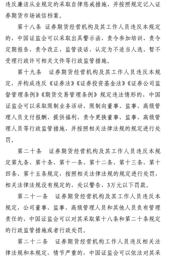 6、(第十八条)证券期货经营机构及其工作人员违反廉洁从业规定的,证监会可以采取出具警示函责令参加培训、责令定期报告、责令改正、监管谈话、认定为不适当人选、暂不受理行政许可相关文件等行政监管措施。严重者可采取市场禁入措施,或移交司法。