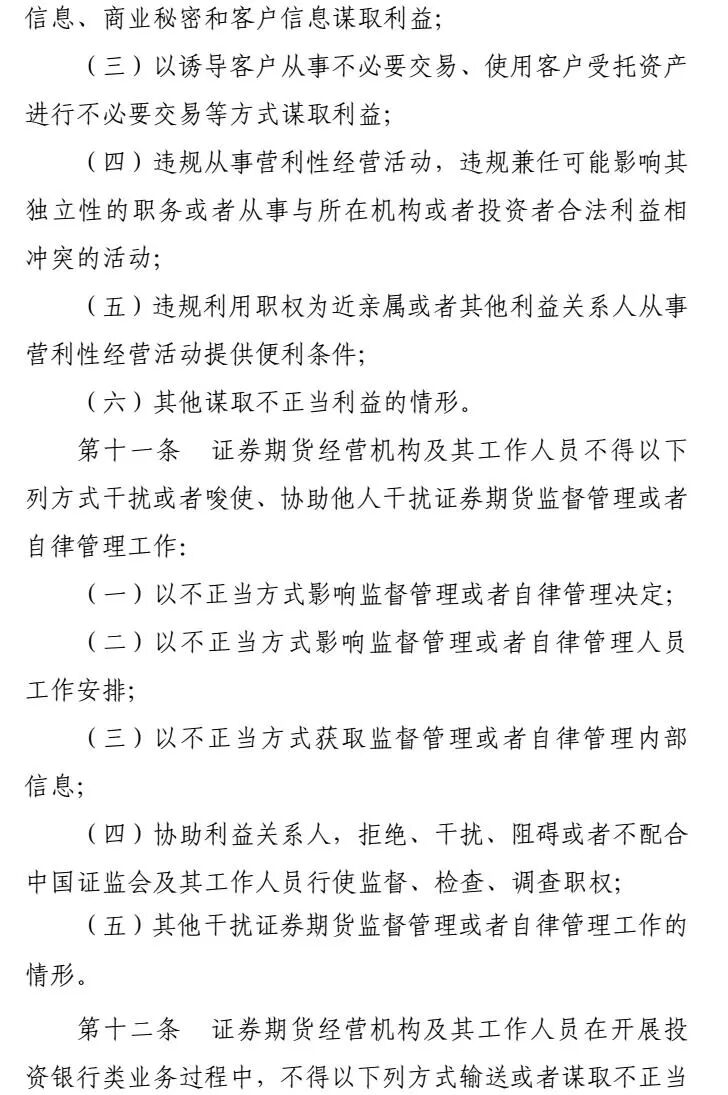 3、(第十条)证券期货经营机构工作人员不得谋取不正当利益,包括直接或者间接收受、索取他人的财物或者利益;直接或者间接利用他人提供的内幕信息、未公开信息、商业秘密和客户信息谋取利益等六项内容。