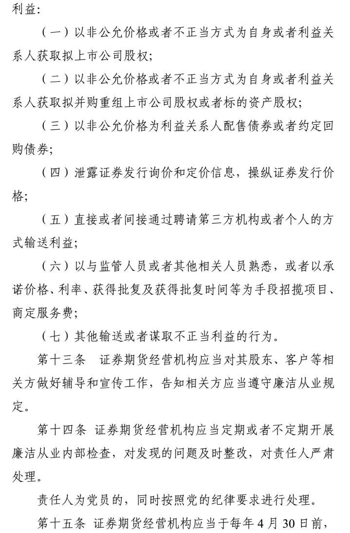 2、(第十二条)证券期货经营机构及其工作人员在开展投行业务时,不得输送或者谋取不正当利益,包括以非公允价格或者不正当方式为自身或者利益关系人获取拟上市公司股权、获取拟并购重组上市公司股权或者标的资产股权等七项内容。
