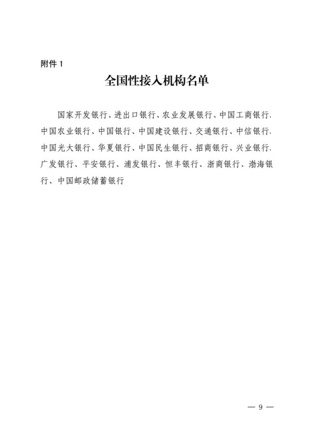 根据102号文,全国性接入机构名单包括:国家开发银行、进出口银行、农业发展银行、中国工商银行、中国农业银行、中国银行、中国建设银行、交通银行、中信银行、中国光大银行、华夏银行、中国民生银行、招商银行、兴业银行、广发银行、平安银行、浦发银行、恒丰银行、浙商银行、渤海银行、中国邮政储蓄银行。
