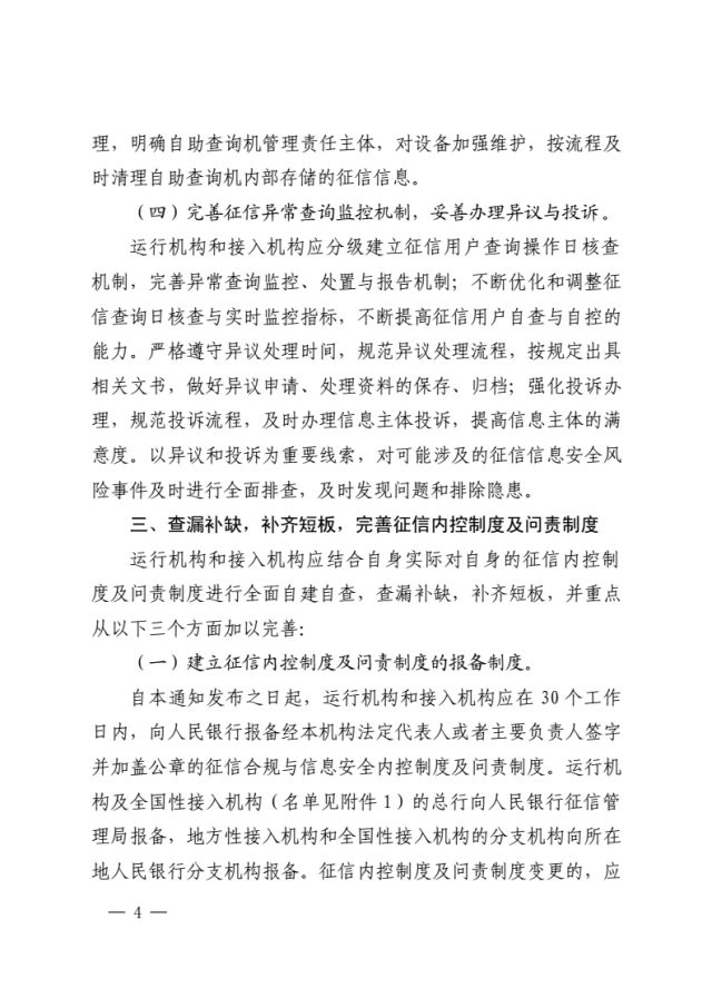 102号文要求完善征信内控制度及问责制度。包括:建立征信内控制度及问责制度的报备制度、建立征信信息安全情况报告制度、建立征信合规与信息安全自查自纠制度及报告制度。