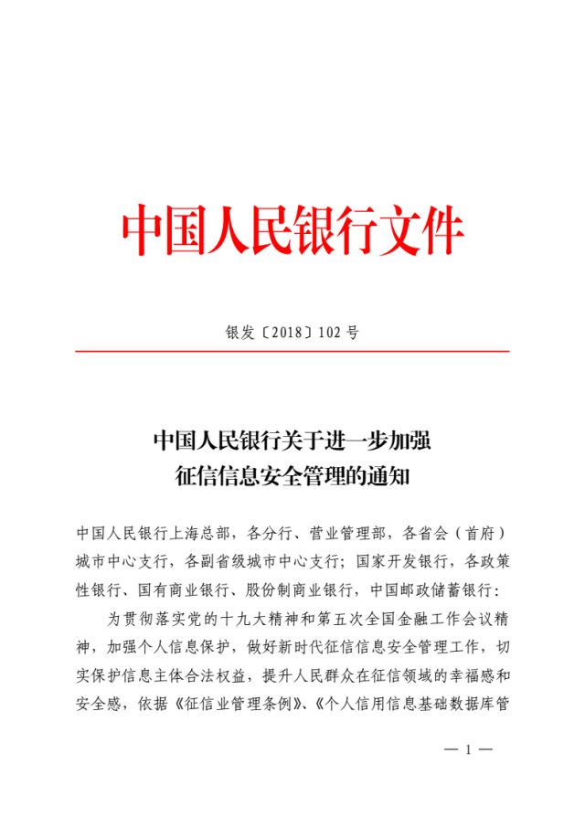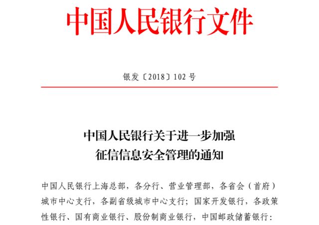 据媒体报道,近日,央行下发《关于进一步加强征信信息安全管理的通知》(银发[2018]102 号)(下文简称“102号文”),进一步加强金融信用信息基础数据库运行机构和接入机构征信信息安全管理。