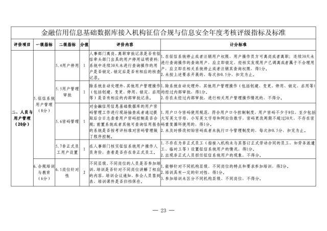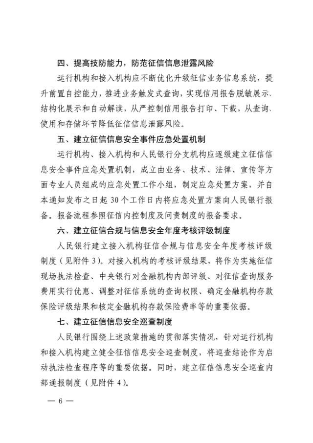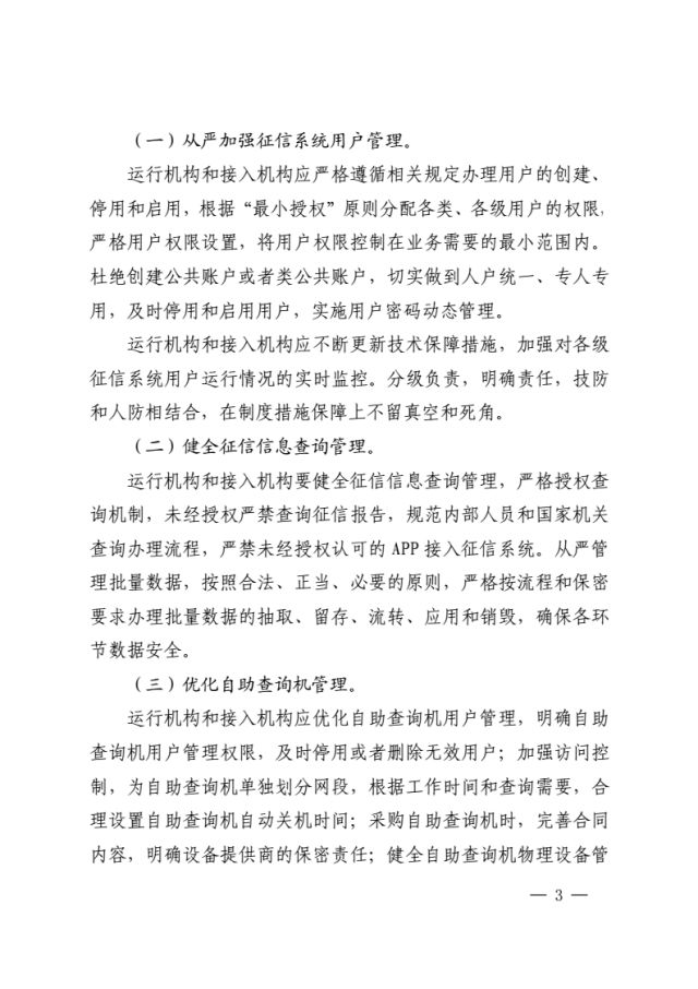 其中,从严加强征信系统用户管理方面,运行机构和接入机构应严格遵循相关规定办理用户的创建、停用和启用,根据“最小授权”原则分配各类、各级用户的权限,严格用户权限设置,将用户权限控制在业务需要的最小范围内。杜绝创建公共账户或者类公共账户,切实做到人户统一、专人专用,及时停用和启用用户,实施用户密码动态管理。运行机构和接入机构应不断更新技术保障措施,加强对各级征信系统用户运行情况的实时监控。分级负责,明确责任,技防和人防相结合,在制度措施保障上不留真空和死角。