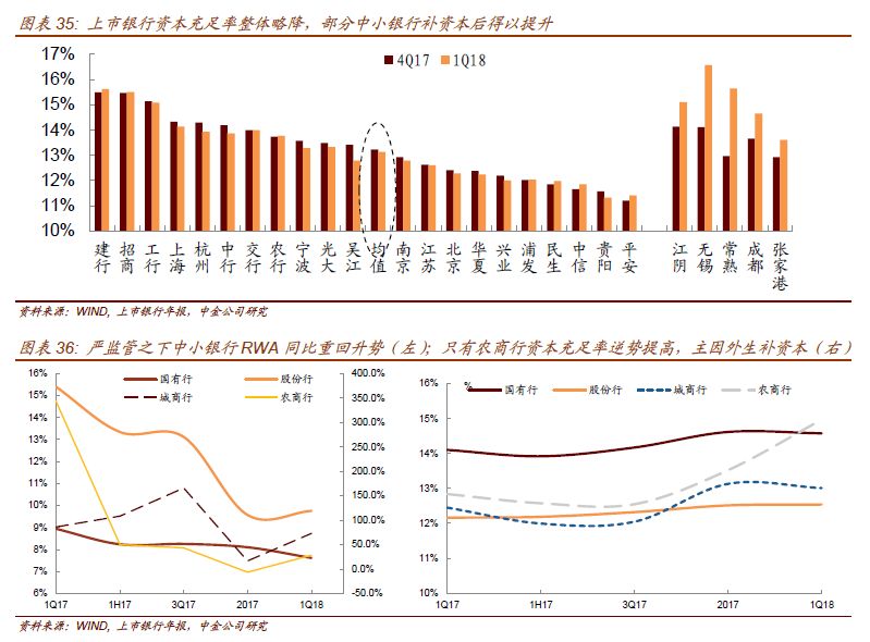 其他未进行外生资本补充的银行中,除了像招行这样通过较高的ROE实现分子的内生增长和资本充足率持平,其他银行受制于放缓的内生利润增长和计入更多风险资产,故总体资本充足率处于下行趋势。为找出原因,我们具体拆分资本充足率的分子(核心一级资本)和分母(RWA)。1)分母的变化是主要的影响因素。17年末RWA下降的重要原因,是银行资产端增加低风险权重的买入返售和债券投资,减少100%计提的股权及其他投资。但是18年以来资管新规的推进将使中小银行RWA同比增长见底回升(图36),目前RWA已经体现出这一趋势。2)如果没有外生补充资本,ROE也没有显著变化,那么分子基本不变。新金融工具准则IFRS 9通过提高银行的拨备要求,降低银行的净资本。IFRS 9放弃现行的已发生损失模型,引入预期信用损失减值模型,在前瞻性基础上考虑和评价金融资产减值的问题。导致贷款减值准备增加,以平安银行为例,新准则实施后对应拨备覆盖率增加13个百分点。减值处理后,一次性补提的拨备扣减未分配利润从而记入净资产,以平安银行来看净资产减少1.7%,核心一级资本充足率下降21bp。如果扣除这一影响后,平安银行18Q1的资本充足率实际上升。