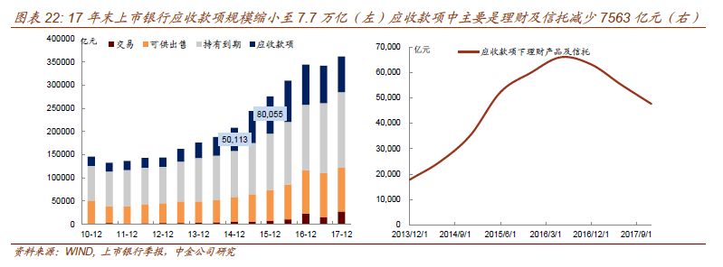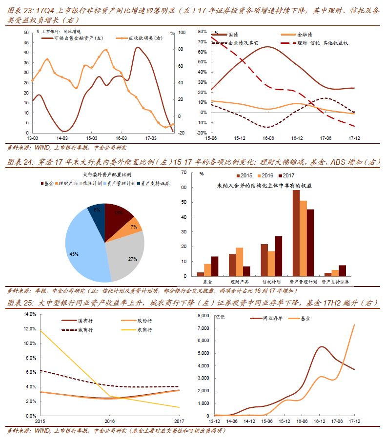 从17年报附注对于“交易性金融资产”“应收款项”“可供出售金融资产”“持有至到期投资”的披露,穿透之后也可以汇总证券投资中标债和非标的投向情况(图23右)。整体看,17年证券投资增速持续下降,仅持有国债增速略有上升。其中非标——理财、信托及各类受益权负增长。