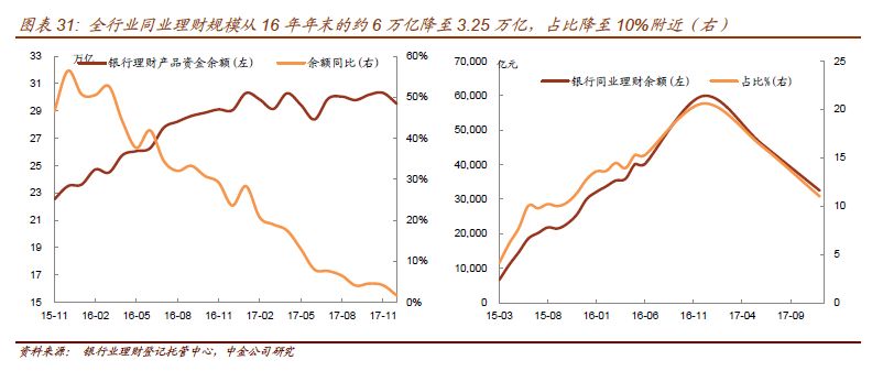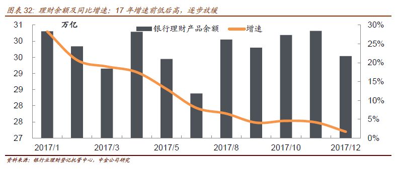 往后看,MPA考核压力,叠加资管新规要求表外理财成立独立的资管子公司或资管部门以净值化产品的方式运作,短期内面临基金、券商收益凭证、资管计划等的竞争都没有优势。未来银行理财规模增长仍将放缓,但不排除理财资金流出带动银行理财规模阶段性下降的情况出现。
