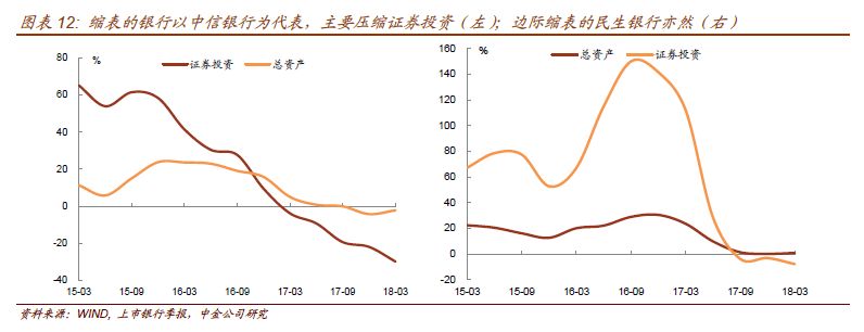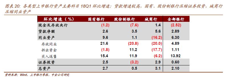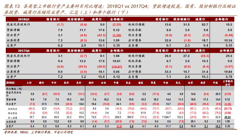 以股份制银行作为分析重点,股份制银行受制于一般存款乏力,18Q1总负债增速仅2.3%,对应总资产增速2.9%;虽然总体增速为正,仍有部分银行出现了缩表:18Q1中信、浦发、招行环比缩表,中信同比缩表。各科目中,贷款是唯一增速为正的项目,拉动总资产正增长;现金与存放央行、贷款、证券投资(四分类加总)同比增速-5.4%、11.7%、-8%,同比均较17Q4下降,只有同业资产降幅缩小。相比之下,城商行就显得更为激进,除同业资产外各项资产均保持较高的同比增速,尤其是贷款项目增速。