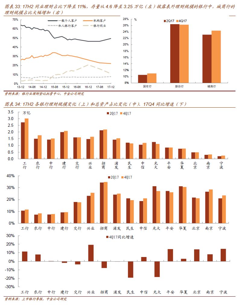 表外业务方面,我们从17年年报和半年报中摘取了各行的表外理财规模,16家上市银行理财总量从17H1的20.41万亿增加到了年末的21.48万亿,图33可见17H2国有行基本都在增加,股份行中招商、兴业、中信、浦发规模增长明显,其余银行则基本持平。从占比看,兴业、中信上升较多。但从全年的同比增速看,兴业增速最快,宁波等城商行增速快于其他银行类别。