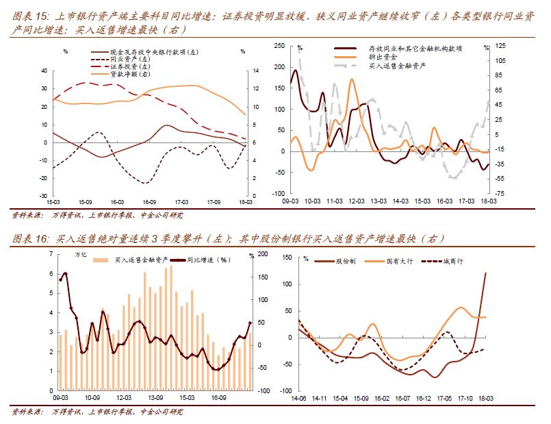 狭义的同业资产有所恢复,18Q1同比增速为-1.35%,降幅较17年年末的-14.47%放缓,主要由于买入返售金融资产的扩张,包括债券回购、票据回购等,股份制银行实现了超过1倍的同比增长。一部分原因是实施MPA考核后造成17年初的低基数(因此环比上升仅11.8%),更重要是18Q1资金超预期宽松,从银行类别看,买入返售爆发式增长的是股份制银行,增速达到121%,背后原因还是缺负债下银行增配低风险权重(~20%)的买入返售资产。