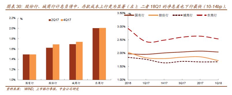 从上市银行2018年1季度的净息差来看,生息资产收益率下降2bp,计息负债付息率上行2bp左右,导致净息差收窄3bp。由于净息差受IFRS 9和部分银行调整17Q4的统计口径影响比较大,净息差指标只具有一定的参考价值。其中国有行计息负债付息率平均仅1.7%,虽然在存款竞争之下也较上年末上行了2bp,一般存款的优势使得其资金成本明显低于其他银行近100bp。对应到净息差方面,国有行、城商行分别收窄3、2bp,农商行、股份制银行收窄24、14bp,股份制银行净息差收窄还是凸显了负债端压力,即使剔除IFRS 9影响后,应该也是上升的势头。以不采用新准则的华夏/兴业银行为例,计息负债付息率上升18/9bps,净息差上升6/2bps。农商行收窄幅度最大主因其生息资产收益率下行更为显著,与其在严监管环境下收缩同业资产有关。过去农商行由于投资同业、非标资产,生息资产收益率一直领先于其他银行,在严监管环境下受到的冲击也最大。