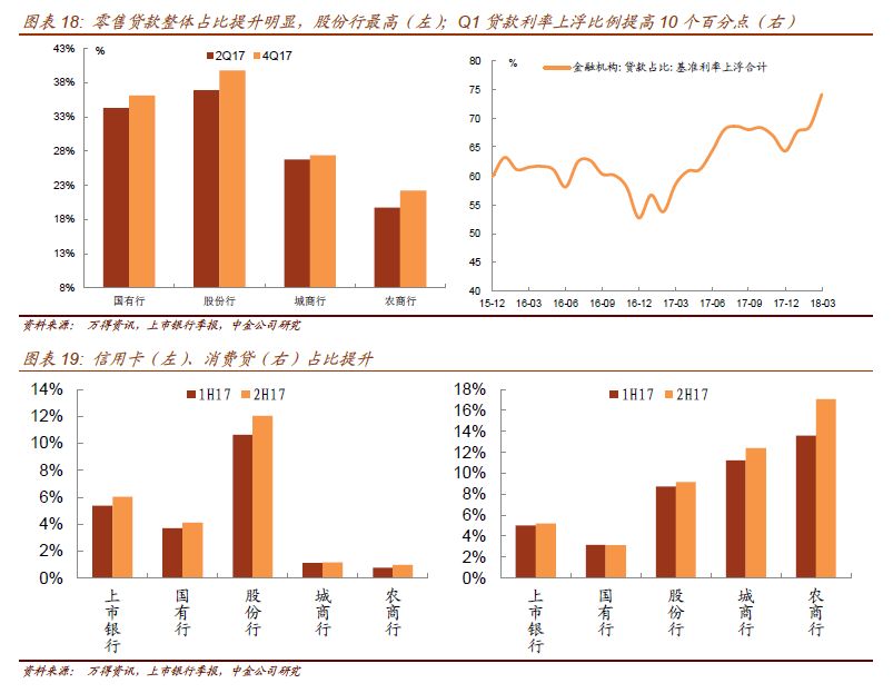 缺存款的银行偏好于个人经营贷、消费贷及信用卡贷款。16家上市银行整体贷款同比增速维持在10%左右,但其中占比的变化耐人寻味:17年下半年零售贷款提升,制造业为代表的企业类贷款占比下降,一方面因为企业贷款定价上升速度跟不上负债成本提升,另一方面,个人贷款计提的风险资产权重低于企业贷款,迫于盈利的压力和资本充足率下降的约束,银行将信贷资源向零售条线倾斜,包括个人按揭、消费贷款(图18),因此去年居民杠杆仍以较快的速度提升。此外,企业类贷款下半年占比下降,还有一个重要原因是财政部的87号文约束了银行向城投平台发放政府采购服务类的贷款,也导致去年下半年平台类贷款增速放缓。根据最新发布的一季度货币政策报告,Q1贷款利率上浮的比例提高 10个百分点至74.35%,为历史新高(图19),体现了实体融资需求的旺盛。