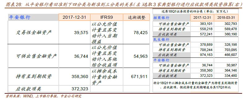 对于18Q1执行IFRS 9的银行,我们无从获取非标相关科目,只有中信银行披露了投资性金融资产这个汇总项,其余银行都是披露了三分类的细项。给分析造成麻烦的是,IFRS 9不要求三分类的科目进行回溯,从而无法在新分类的框架下分析非标投资的趋势。平安银行在17年报中自愿披露了追溯调整的三分类(图28),从而方便理解新旧科目之间数量的对应关系,帮助我们预测18Q1三分类的趋势。从平安银行的财报可以看出,由于以摊余成本计量的金融资产一般包括了过去四分类下的持有至到期投资、应收款项,交易性金融资产一般包括以公允价值计量且其变动计入当期损益,以公允价值计量且其变动计入其他综合收益项包括过去的可供出售金融资产。为了获得18Q1应收款项类投资的可比口径,我们通过以下方法进行推算,还原18Q1证券投资的四分类。主要是拆分18Q1中以摊余成本计量的金融资产为持有至到期投资、应收款项,由于持有至到期资产主要是标债,一般比较稳定,我们假设持有至到期增速延续季节性,采用其17Q1的环比,将以摊余成本计量的金融资产减去推算的持有至到期余额,剩下就是应收款项。这种演示性的方法可以帮助我们推算这些股份行应收款项的变化趋势。可见招商、民生、平安三家银行的应收款项类均大幅减少,尤其是民生只剩下不到一半。