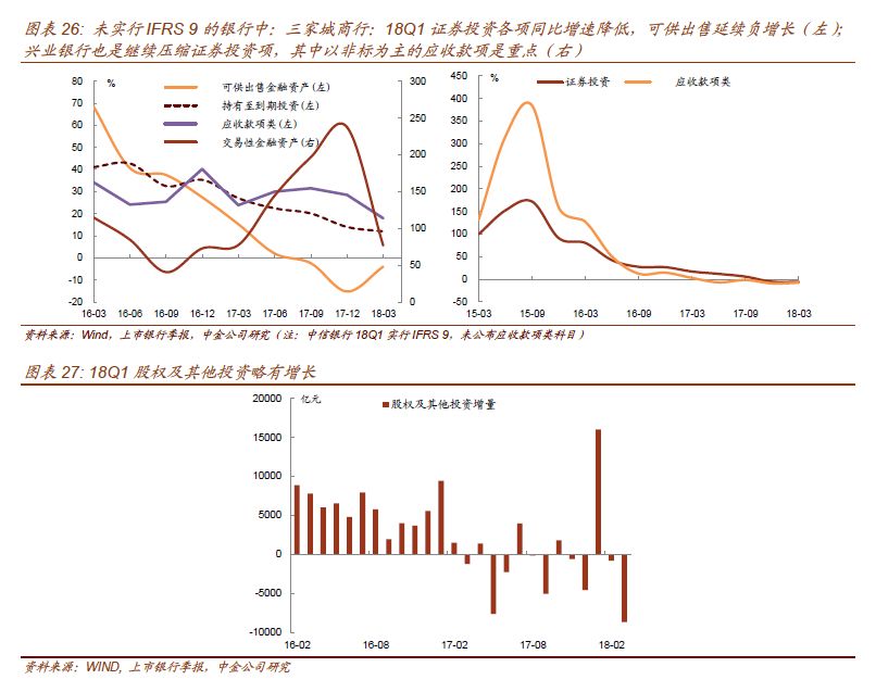 从披露的情况看,16家样本银行中,有11家开始执行IFRS 9,另外5家——兴业、华夏和北京、南京、宁波三家城商行暂无执行新准则,仍然沿用过去的披露。对于披露规则未变的城商行,可以考察其非标的变化趋势。我们计算的证券投资各项同比增速17年以来持续下降,符合预期。各项中,可供出售17年以来连续3个季度负增长,但是减速已经放缓,而交易性金融资产断崖式下降。北京、南京、宁波三家城商行合计的应收款项投资平均仍在逆势上升,同比增速高达17.9%,但是增速较17Q4的28.5%有所下降,主因宁波银行18Q1的同比与环比均负增长。对于18Q1尚未执行IFRS 9的规定的兴业银行,我们做同样的分析,应收款项投资18Q1同比仍然是负增长,不过增速已经边际放缓,看来兴业的非标投资压减调整已经到位(图26)。