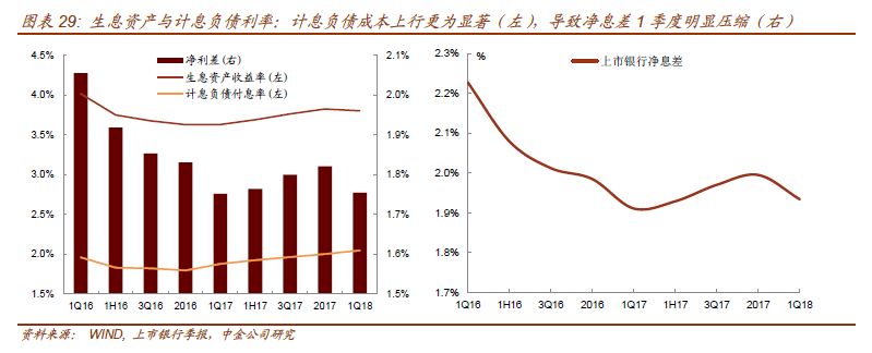 总体来看,17年末生息资产收益率较之前有所上行,得益于贷款、金融产品投资和存放同业收益率的快速上升,计息负债付息率略有上升,计息负债成本上行不显著,导致净息差和净利差都有提升。但进入18年,计息负债成本上行更为显著,因为存款市场竞争加剧,阶段性提高部分存款品种的利率上浮比例;例如建行、农行在4月领先同业推出大额存单,较央行基准利率上浮45%;股份制银行中招行也调整较快,并根据存款金额不同设置了不同的上浮幅度,40-50%不等。1季度债市走强,生息资产收益率也随着债市收益率开始下行,导致净息差1季度明显压缩,其中股份行压缩最为明显,原因在于:1、计息负债成本上行更为显著;2、IFRS 9下过去计入利息收入的债券投资计入非利息收入,导致生息资产收益率下降。因为IFRS 9下货基、债基的利息收入计入非利息收入(其他综合收益),例如民生银行披露新准则压缩1Q净息差高达22bps。