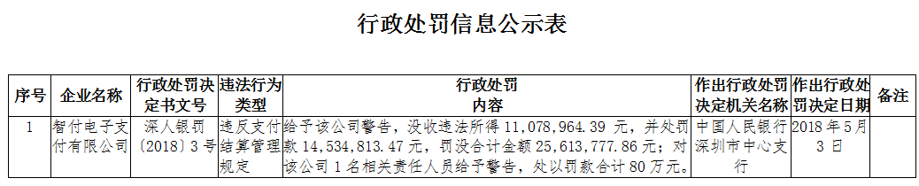 综合考虑智付支付违法违规行为的事实、性质、情节以及社会危害程度,央行深圳市中心支行依据《中华人民共和国中国人民银行法》、《非金融机构支付服务管理办法》、《银行卡收单业务管理办法》等法律法规,对智付公司给予警告,没收违法所得人民币11,078,964.39元,并处罚款人民币14,534,813.47元,合计罚没人民币25,613,777.86元;对该公司相关责任人员给予警告并处罚款。国家外汇管理局深圳市分局依据《中华人民共和国外汇管理条例》对智付公司给予警告,合计处以罚款人民币15,908,000.00元。