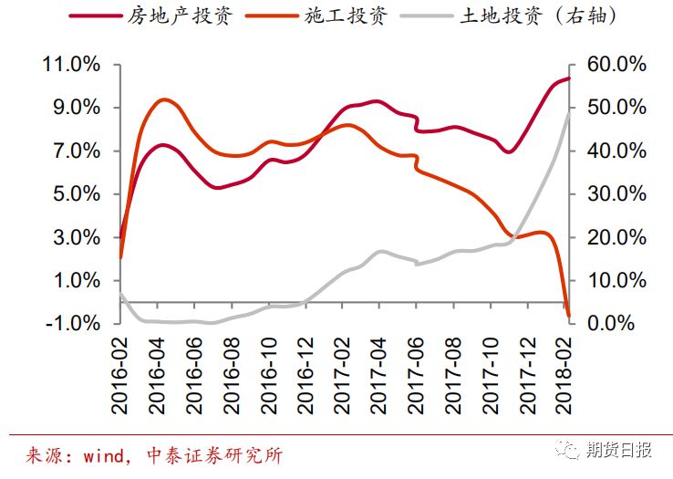 房地产、基建、制造业中短期需求释放看资金面。我们先来说最关键的房地产,1至4月分房地产投资虽然保持一个较理想的增速,但其中大部分的贡献来自于土地投资,最能够反映钢材需求的施工投资增速呈下滑的趋势(见下图),究其背后原因是房地产销售情况走弱。