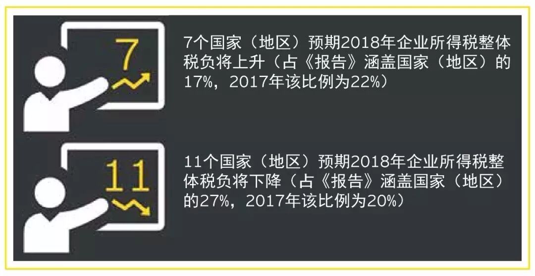 2018年,各国或将继续通过维持或降低企业所得税率来刺激经济并吸引外国直接投资。约27%的被调查国家(地区)预期2018年企业所得税整体税负将下降;而17%的国家(地区)预期该国(地区)税负将上升。