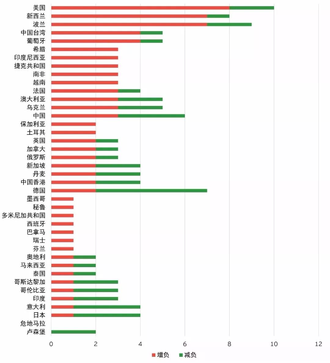 《报告》对部分国家(地区)的税收政策变化所产生的税负影响予以评估(增加或降低),图示如下: