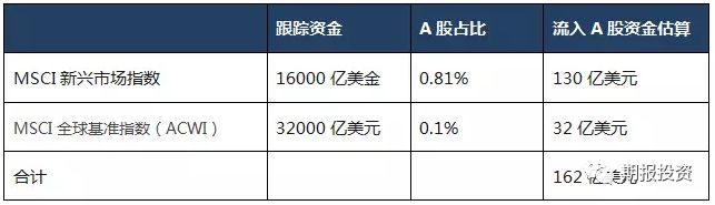 根据MSCI官方的说法,跟踪MSCI新兴市场指数以及ACWI指数投资的资金规模大约分别在1.6万亿和3.2万亿美元,据此可以推算大约有160亿美元资金可能会跟踪MSCI指数而流入A股市场,折合人民币约一千亿的增量资金。