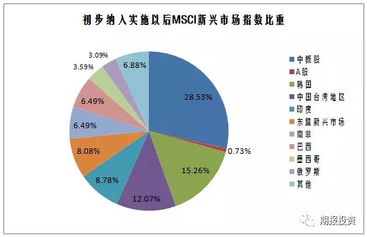 按照MSCI首席中国分析师Zhen Wei于2017年6月发布的数据显示,按5%的纳入因子计算,A股将占指数总比重的0.73%。但是如果将来最终可以按100%的纳入因子计算,A股将占指数总比重的16.9%。