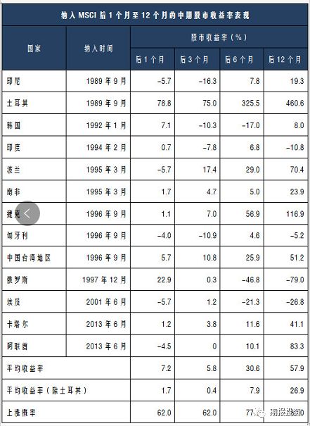 国信证券经济研究所以土耳其、韩国、匈牙利等13个国家为样本,对其纳入MSCI指数后,股票市场1个月、3个月、6个月、12个月的股市收益率表现整理如下: