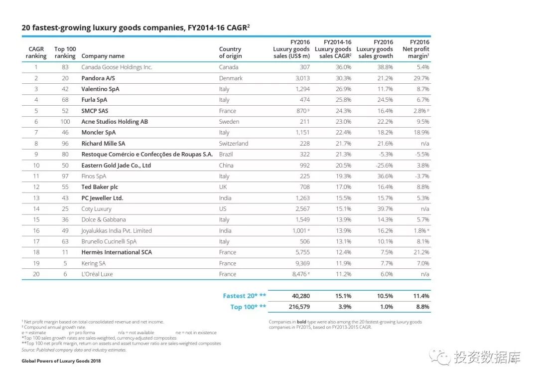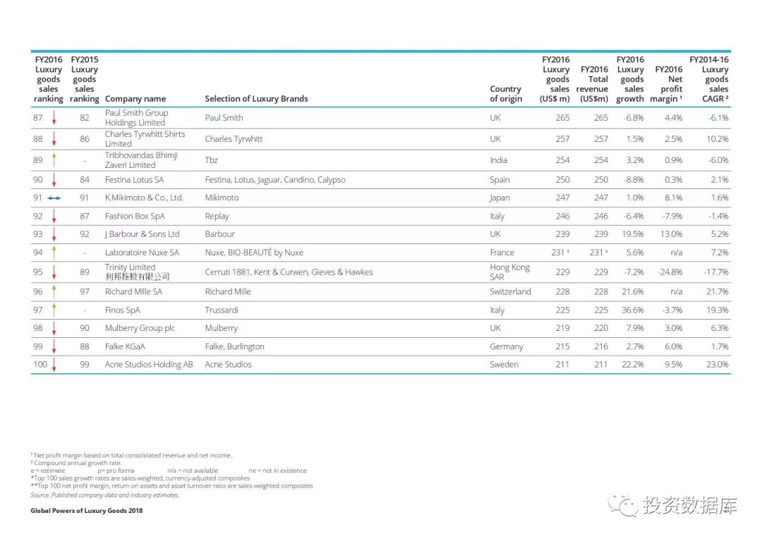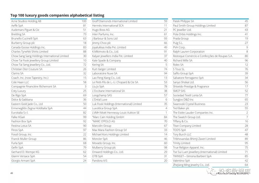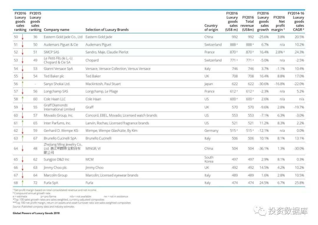 德勤咨询《2018年全球奢侈品力量排行榜》,依据年度销售额对全球奢侈品公司进行排名。