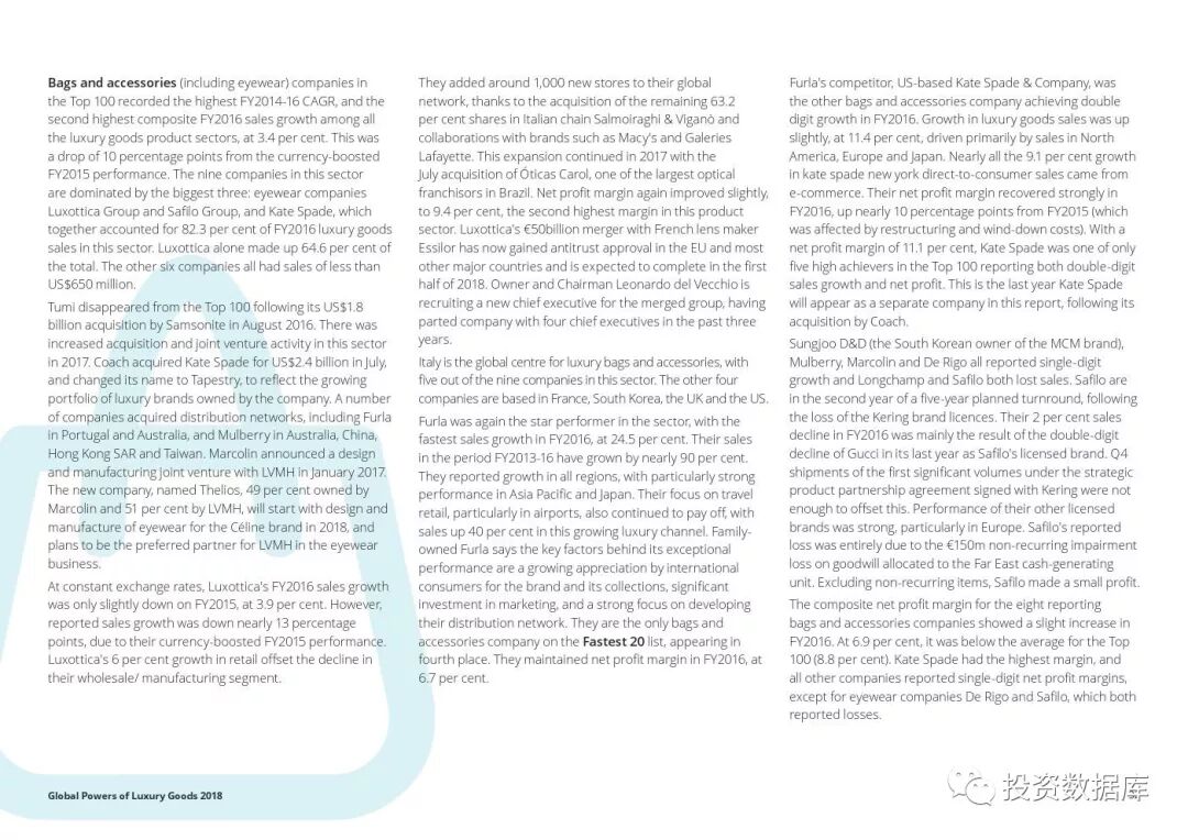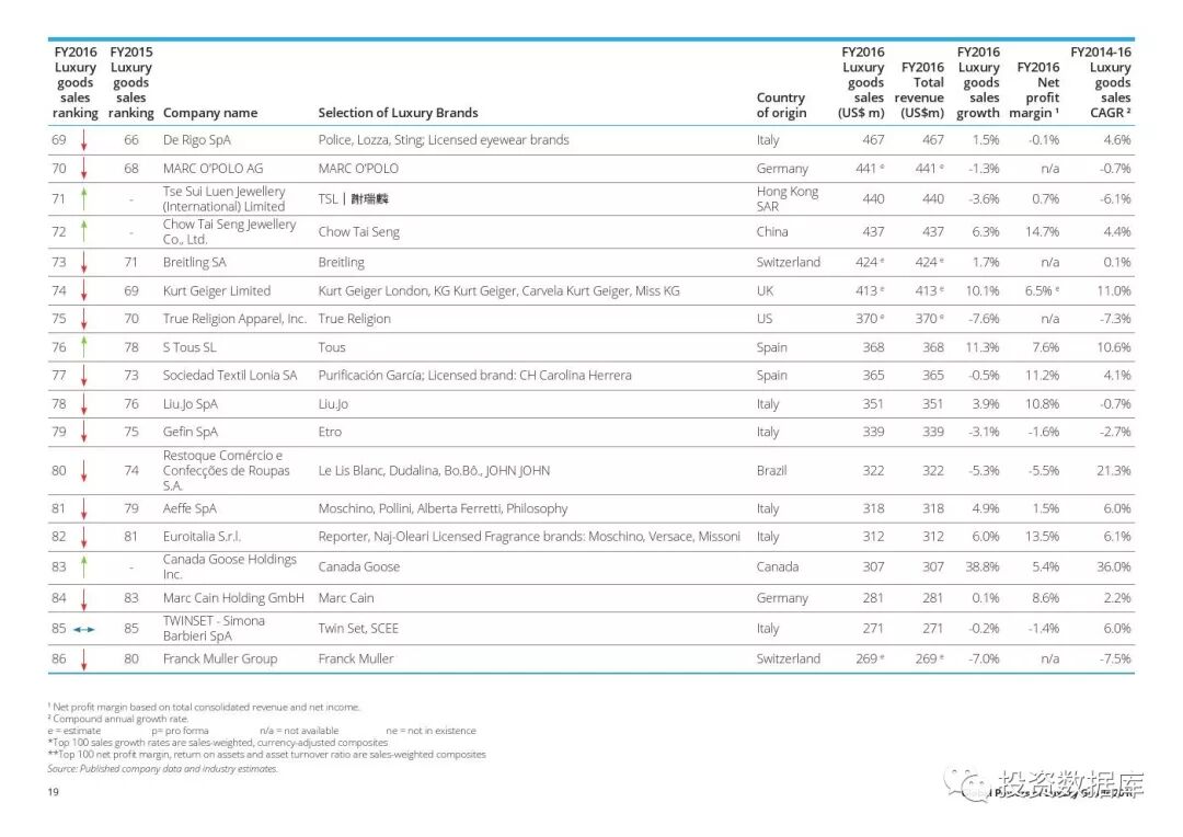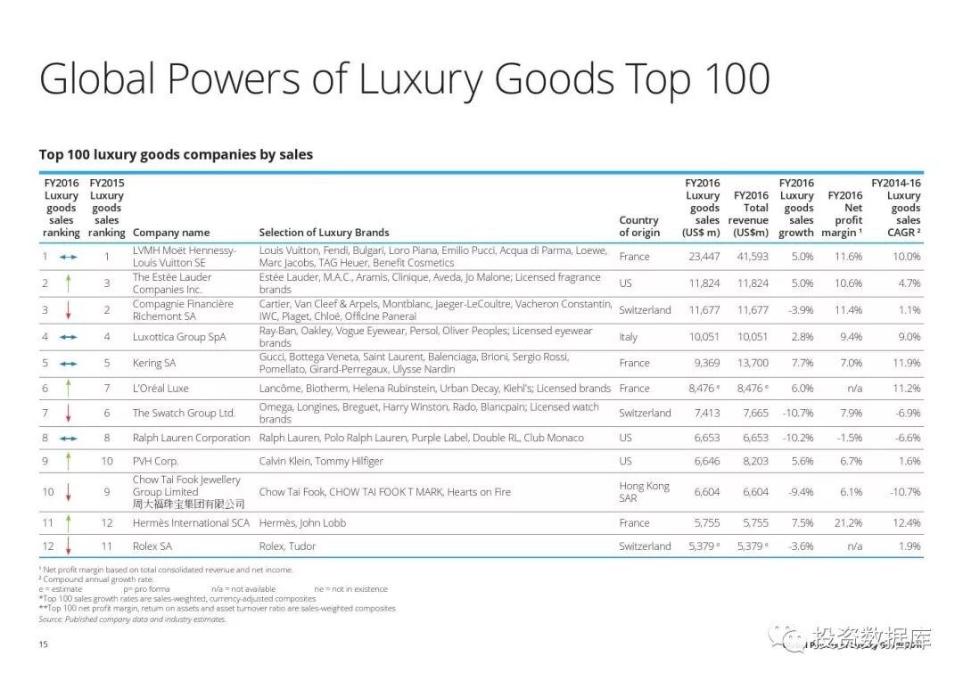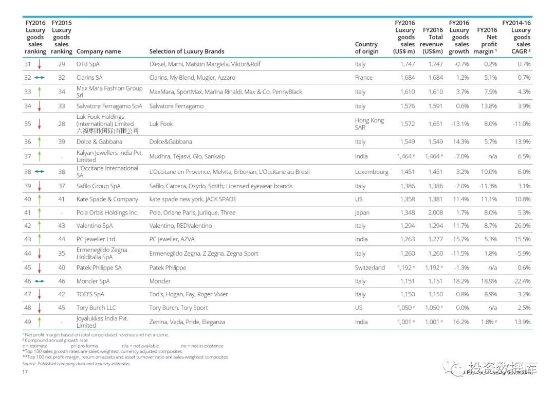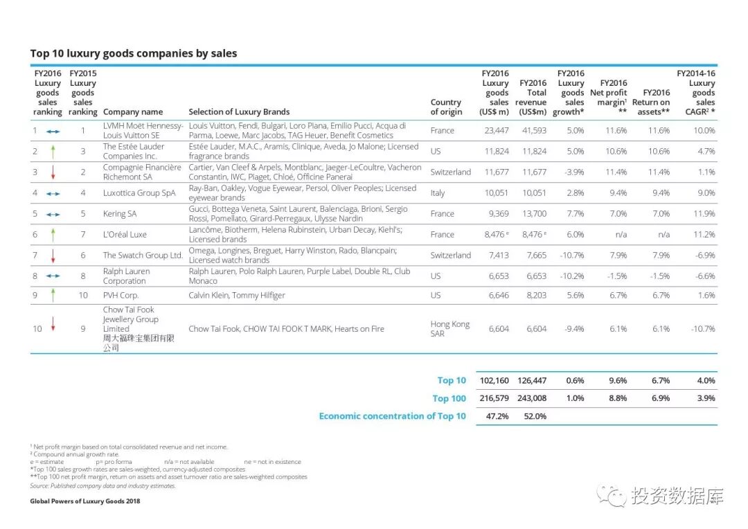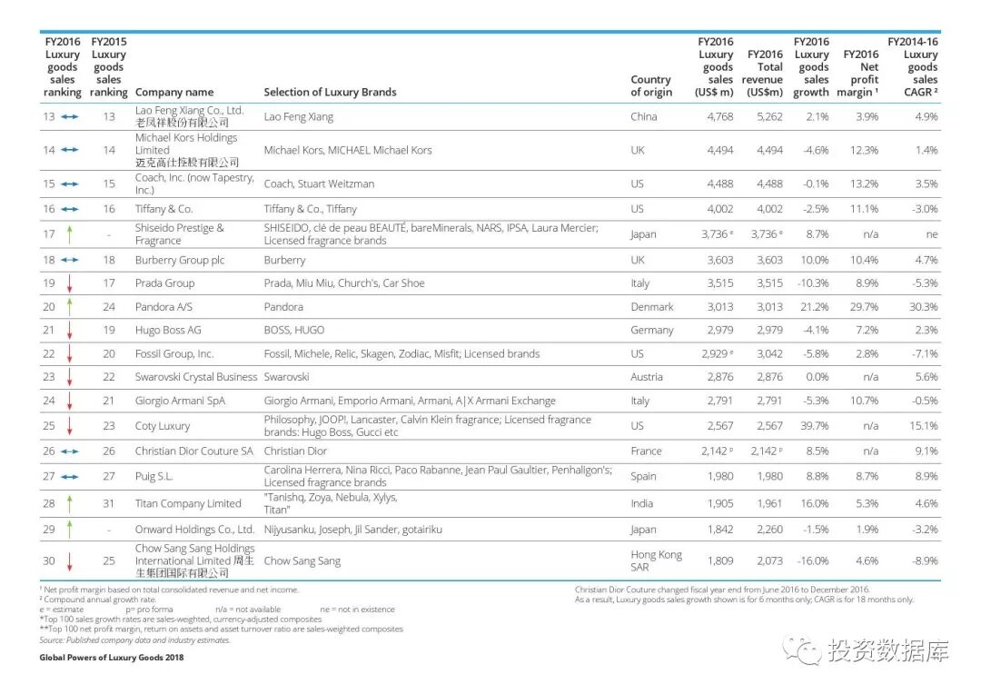 德勤咨询《2018年全球奢侈品力量排行榜》,依据年度销售额对全球奢侈品公司进行排名。在截止2017年6月30日的2016/2017财年,这份报告得出的主要数据如
