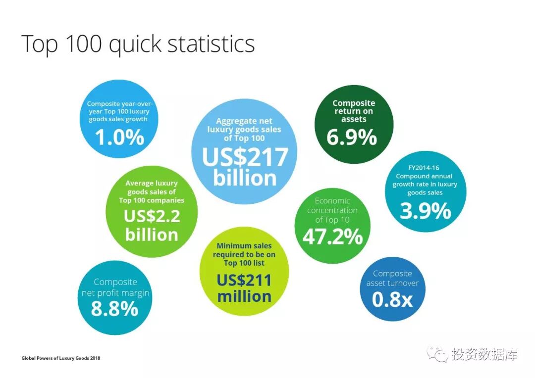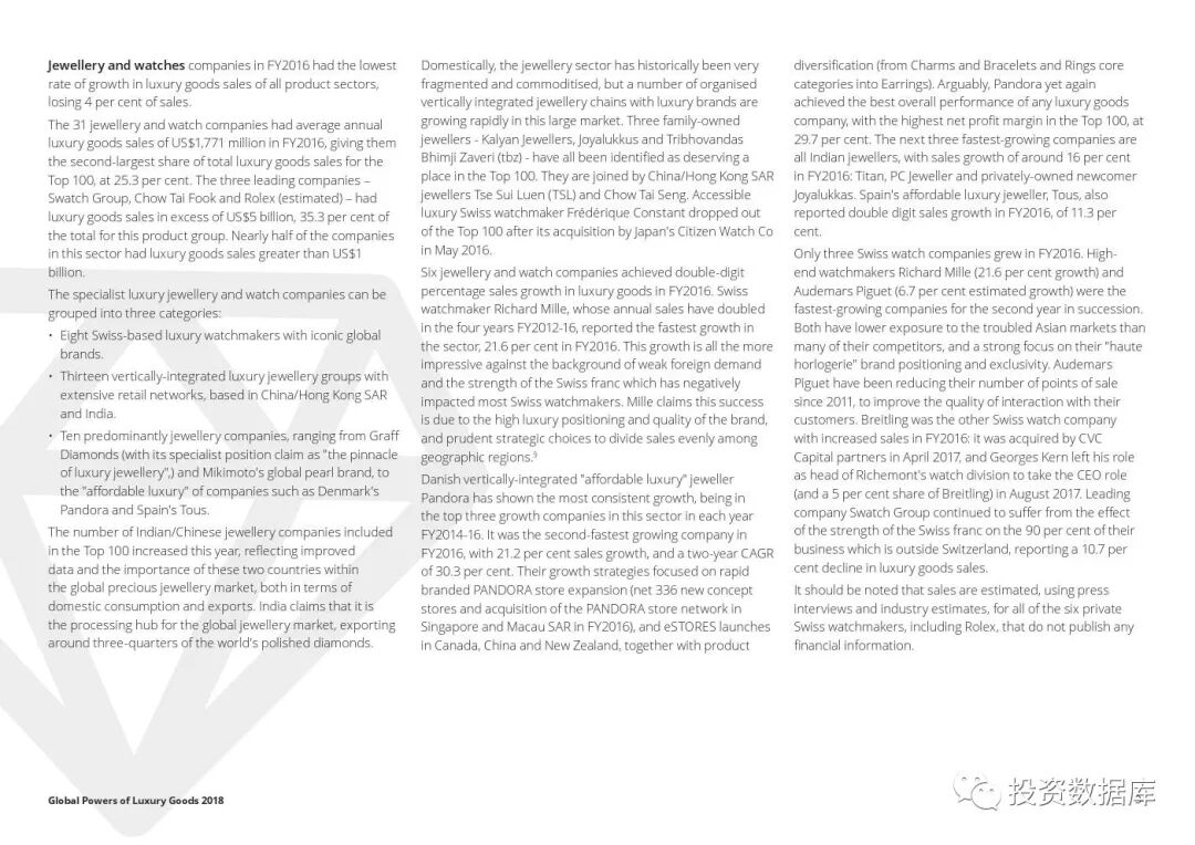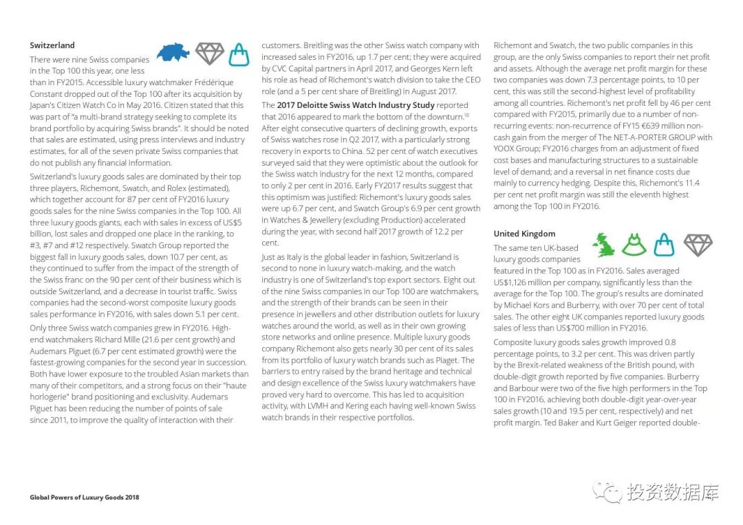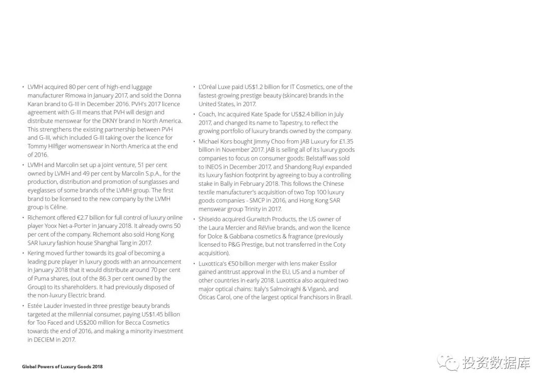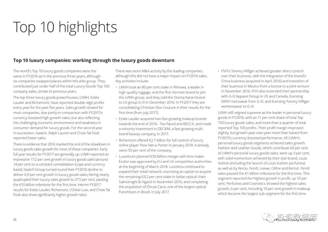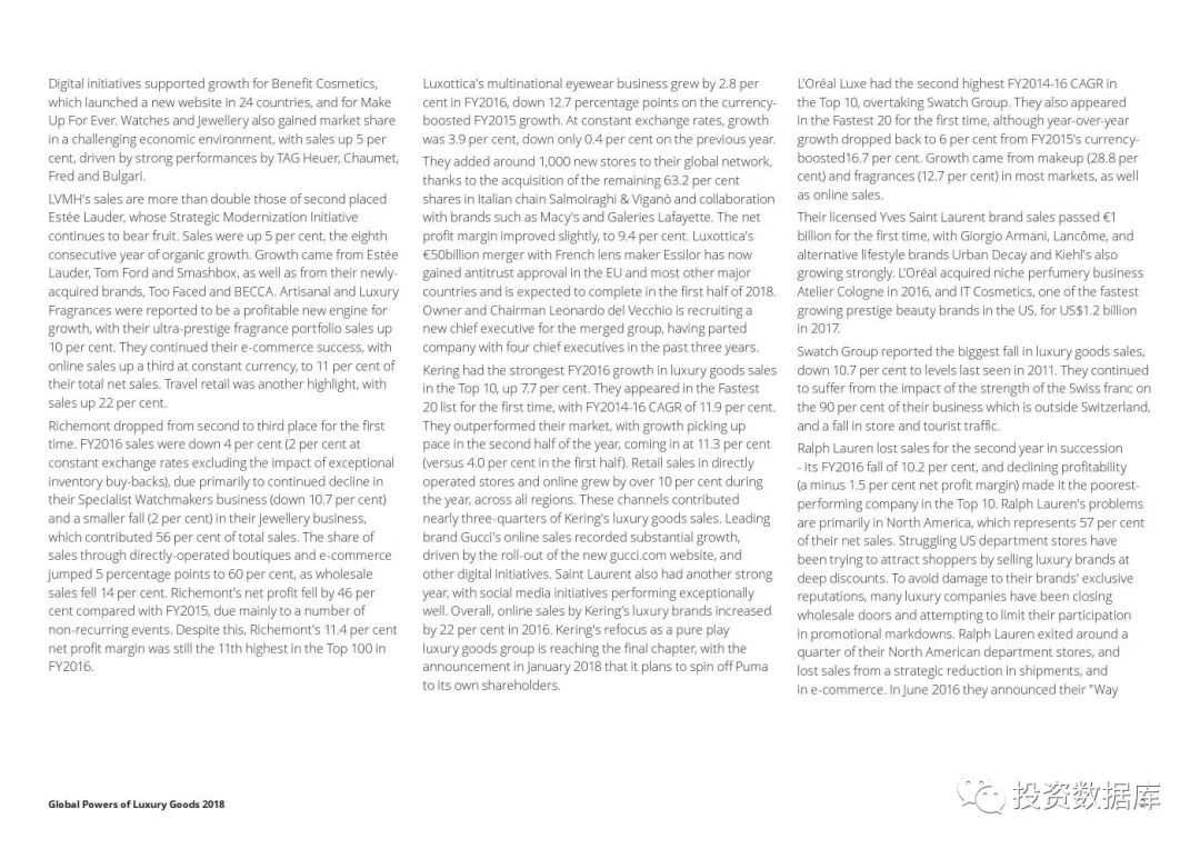 德勤咨询《2018年全球奢侈品力量排行榜》,依据年度销售额对全球奢侈品公司进行排名。在截止2017年6月30日的2016/2017财年,这份报告得出的主要数据如