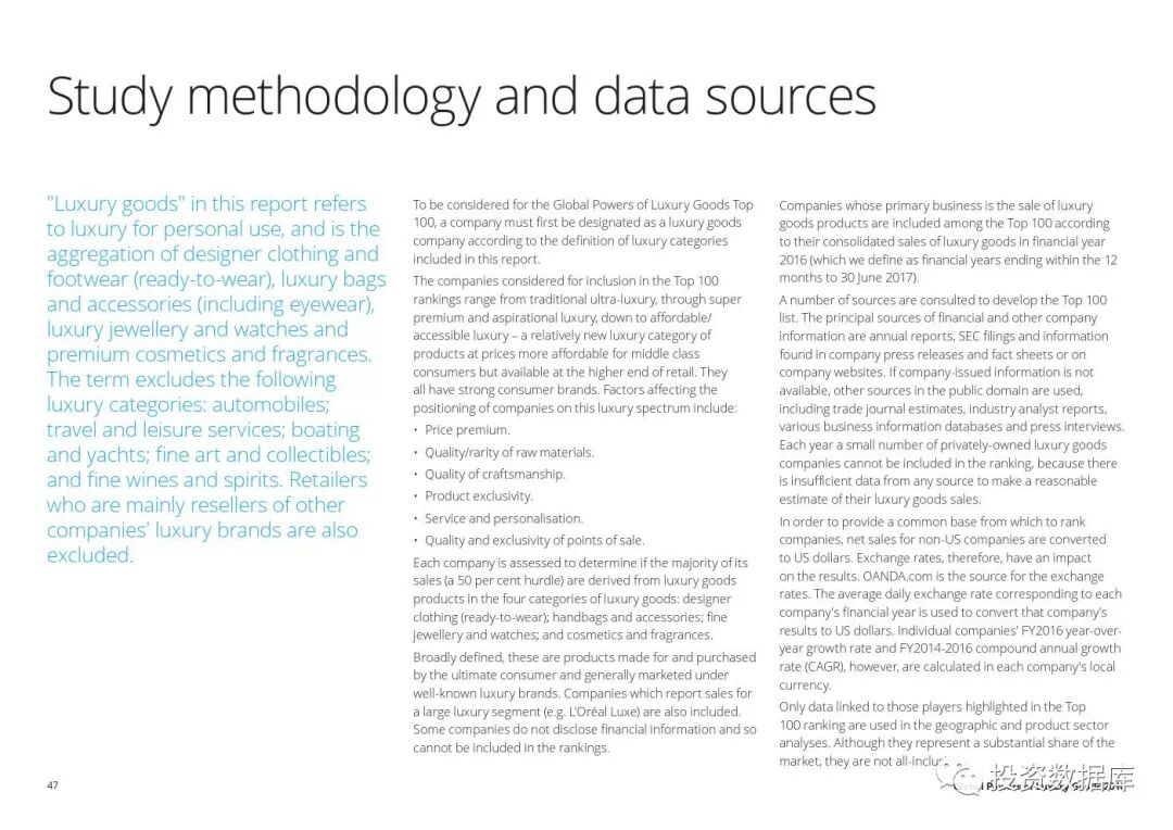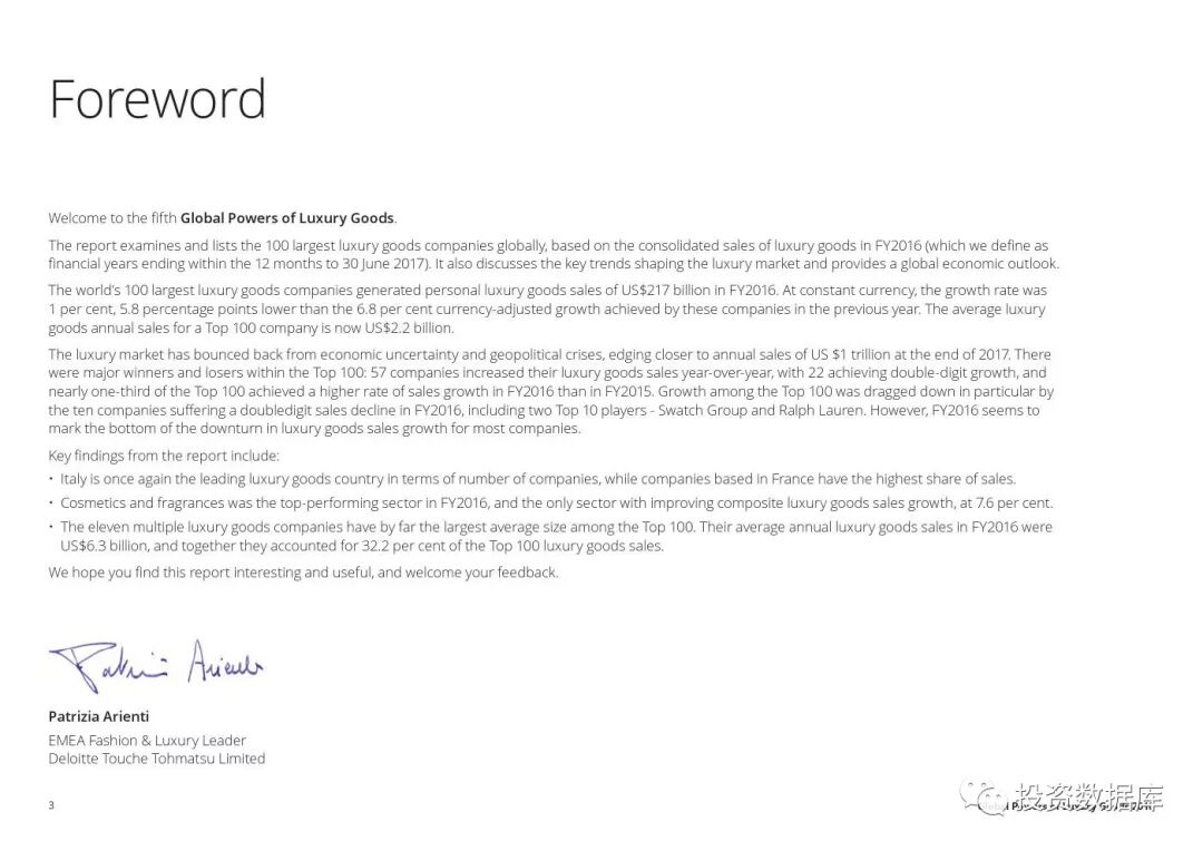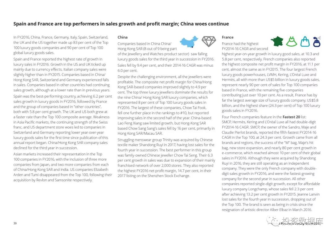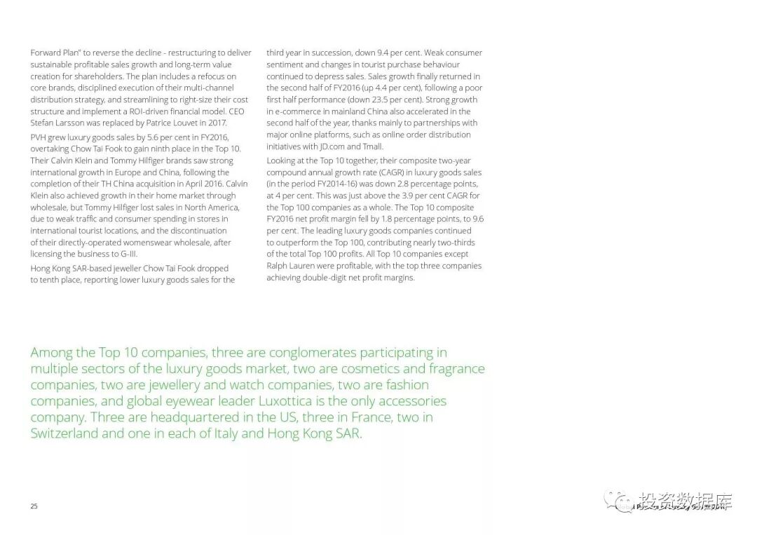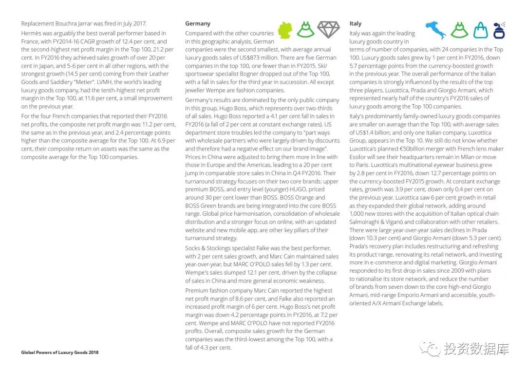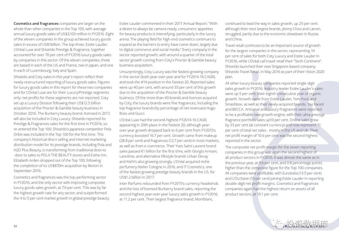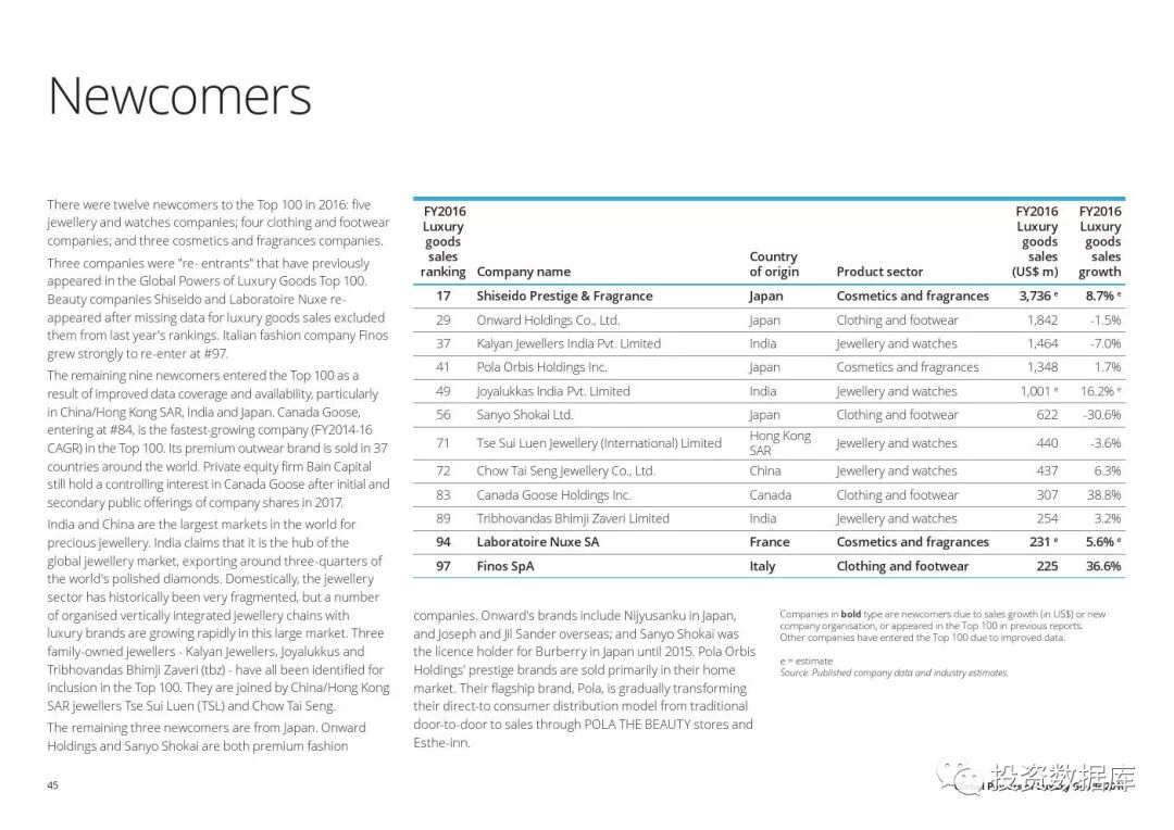 德勤咨询《2018年全球奢侈品力量排行榜》,依据年度销售额对全球奢侈品公司进行排名。在截止2017年6月30日的2016/2017财年,这份报告得出的主要数据如