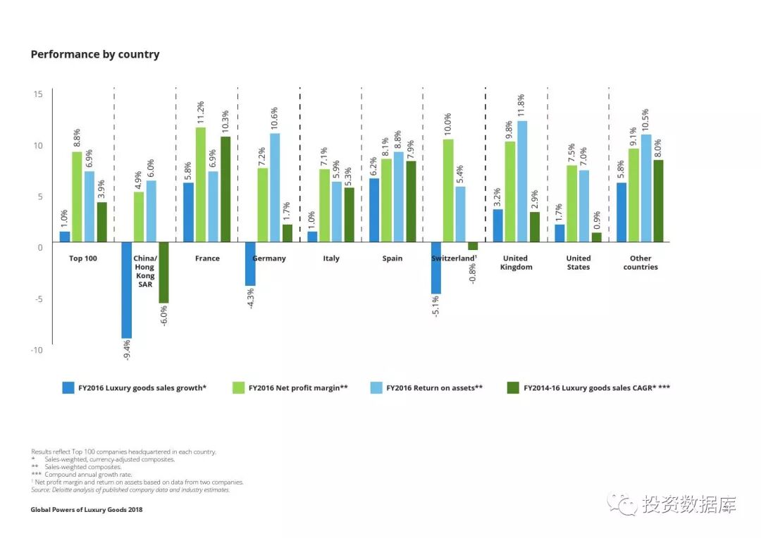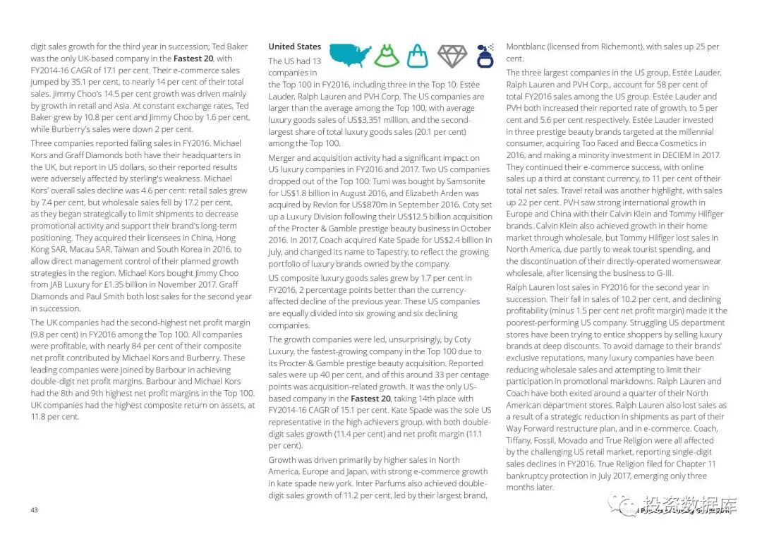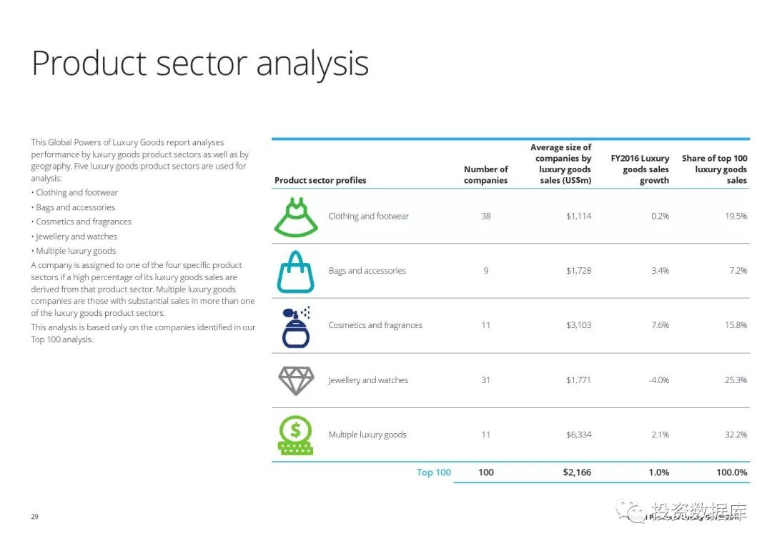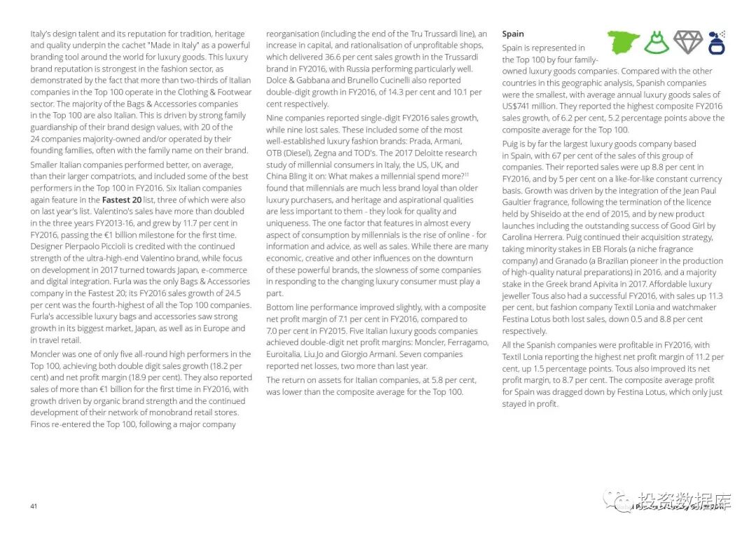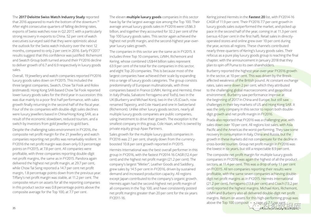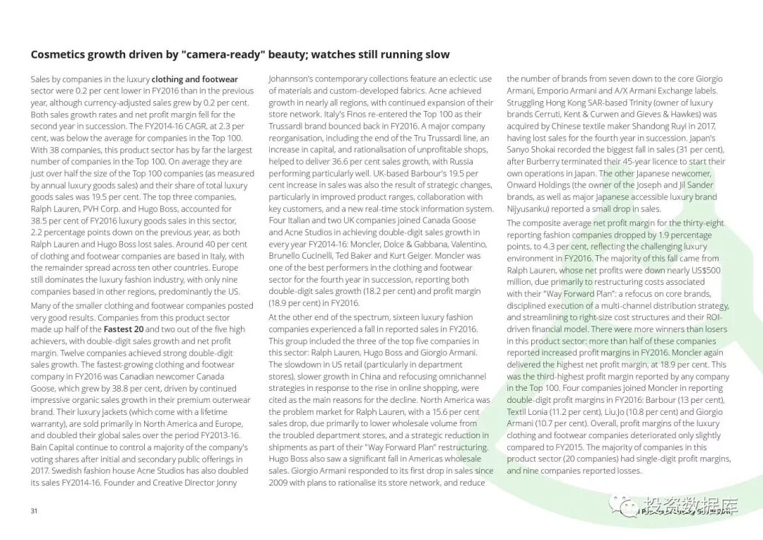 德勤咨询《2018年全球奢侈品力量排行榜》,依据年度销售额对全球奢侈品公司进行排名。在截止2017年6月30日的2016/2017财年,这份报告得出的主要数据如