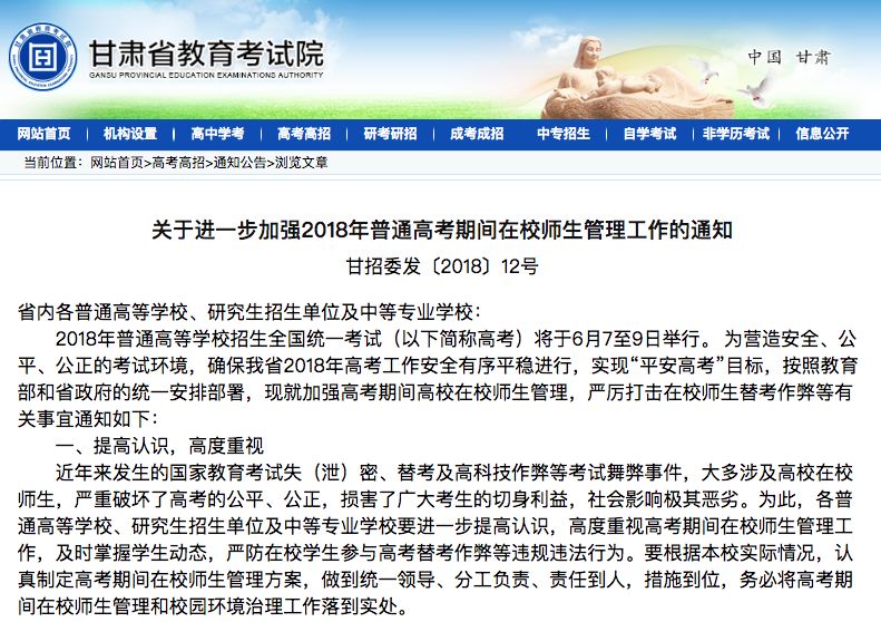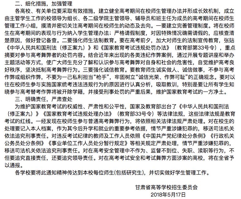 此外,高考期间“严格请假制度”的还有甘肃省,“对因特殊情况确需请假的,应核查清楚原因,做好登记备查。”