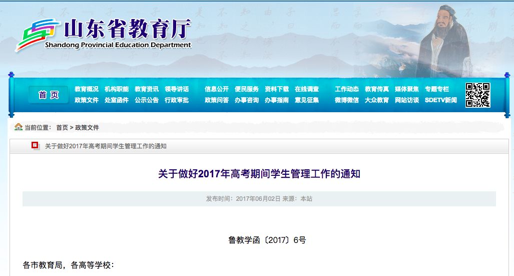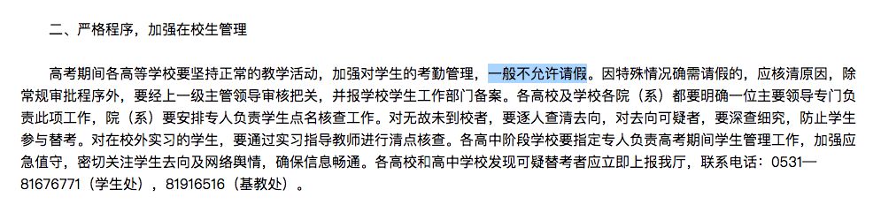 比如在2016年和2017年,山东省教育厅都曾发通知表示,高考期间,高校学生一般不允许请假。