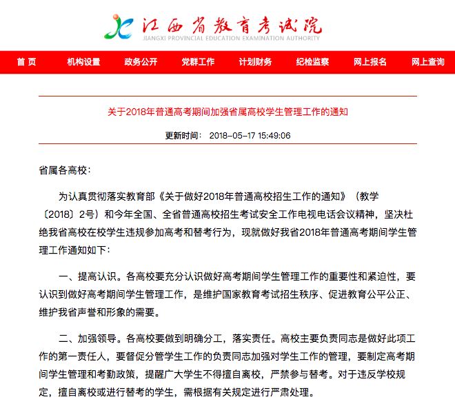 近日,江西省教育厅发通知,要求高考期间加强省属各高校学生管理。