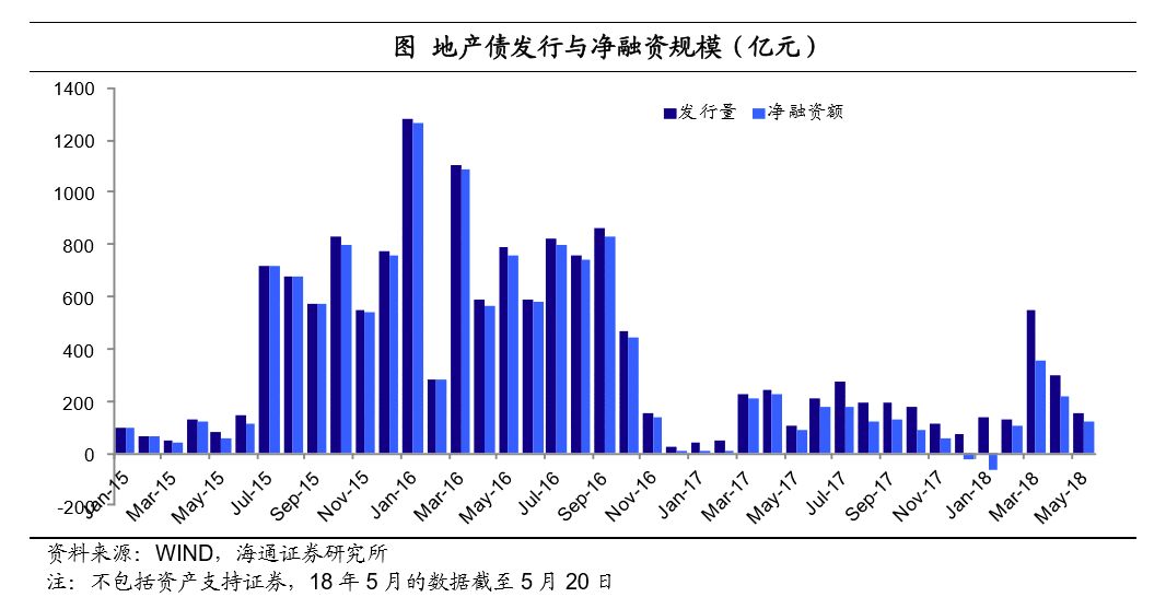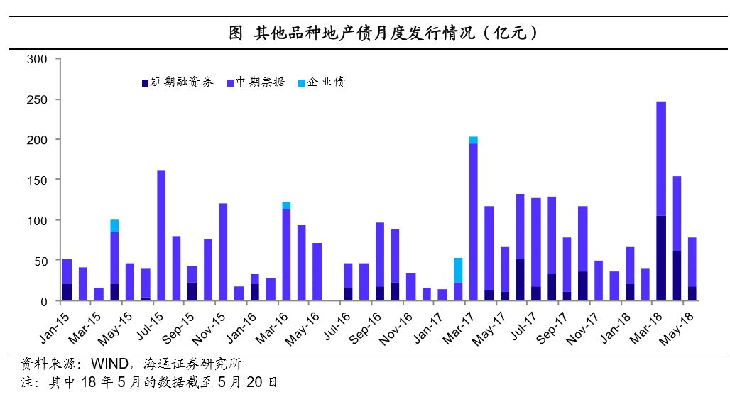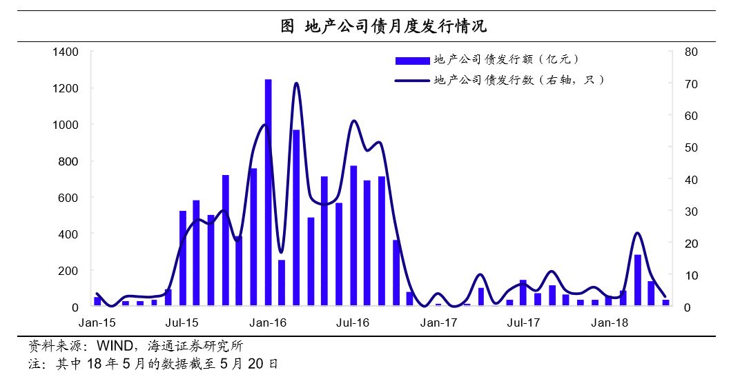 公司债发行量仍旧低迷。从公司债品种看,17年房地产公司债共计发行60只,合计规模只有616亿,不及16年的10%,在17年发行的各类型地产债中,占比只有22%,且超过2/3是私募债。18年1-4月房地产公司债共计发行40只,合计规模554亿,其中3月份发行了23只,4月份10只,但5月份截至20号只有3只房地产公司债发行。