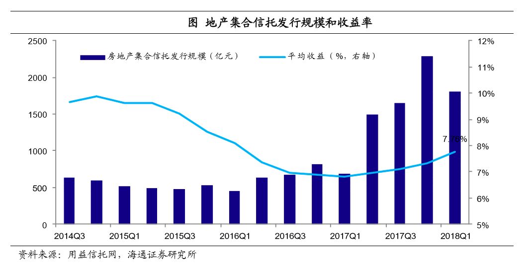 监管重压下,地产信托融资规模趋降。穿透监管、打破刚兑以及期限匹配要求,集合信托类业务亦受影响。特别提出不得违规投向房地产领域,受政策影响,房地产类信托产品发行和融资规模整体呈现下滑趋势。根据用益信托网统计的数据,18年前4个月集合信托产品发行规模合计有5847.31亿,同比增长-21.6%。从房地产类集合信托产品的新增规模看,18年1季度环比大幅回落,从17年四季度的2295.59亿减少至1810.11亿,二季度以来截至5月20日,房地产类集合信托产品新增额仅703亿,仍在逐月减少。