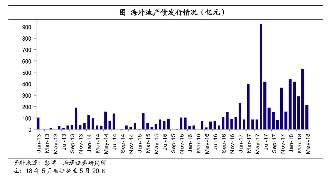 2017年房地产企业海外发债热情高涨。受国内地产债券融资收紧影响,不少房地产企业积极寻求海外发债融资。据彭博统计,2017年国内地产企业海外发债规模达到了3164.6亿元,创历史新高,是16年的4倍,以美元债为主,还有少量境外人民币债。18年以来房地产企业海外发债的热情依旧高涨,截至5月20日,今年已经发行了接近1900亿元的境外债。