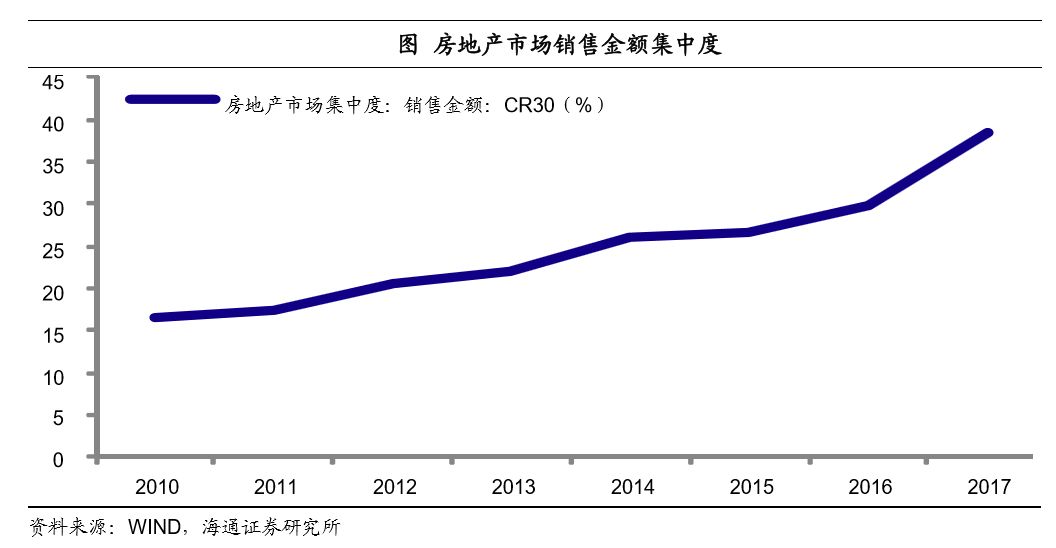 但伴随全社会的紧信用,企业间分化越来越明显,个别企业的信用违约概率在增加。不管是从融资上,还是经营能力上,龙头房企相对安全:1)龙头房企在土地和项目储备、控盘、品牌溢价等方面具有优势,盈利抗冲击能力强;2)龙头企业融资能力相对较强,大型房企往往拥有充分的抵押物,银行给的授信额度也比较多,另外寻求海外发债和进行资产证券化的主体主要是龙头企业;3)地产调控政策下行业洗牌,不少小型房企退场,大中型房企兼并整合,行业集中度不断提高,利好大型龙头。