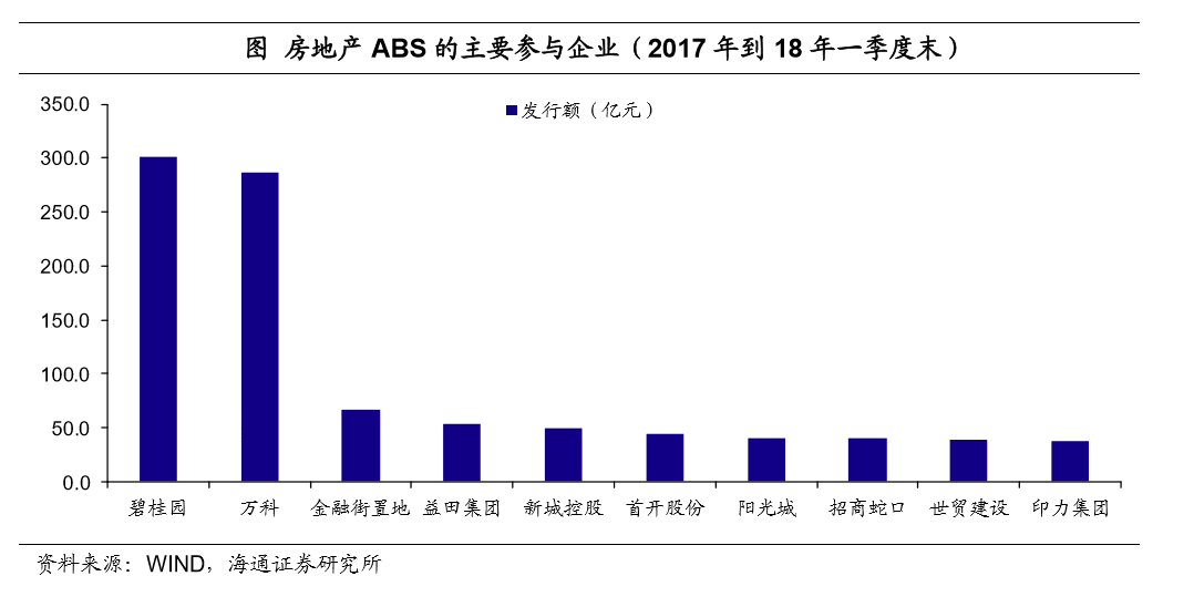 地产龙头为地产ABS的主要参与方。房地产ABS的主要参与机构为传统地产行业龙头,17年以来到18年一季度末,碧桂园和万科参与或发行的房地产ABS规模最大,碧桂园参与发行了301.4亿的地产ABS,占地产ABS发行总额的14.5%,万科参与发行了286.4亿地产ABS,占比为13.8%。