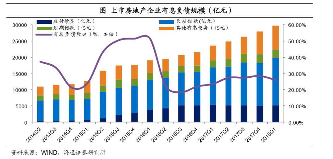 有息债务规模持续攀升。我们通过分析A股全部上市房地产公司的样本,发现17年以来房地产行业有息负债余额增速虽然较15年-16年有明显回落,但仍旧在25%以上的高位水平,截至18年一季度末,上市房地产企业有息债务规模已经接近3万亿。