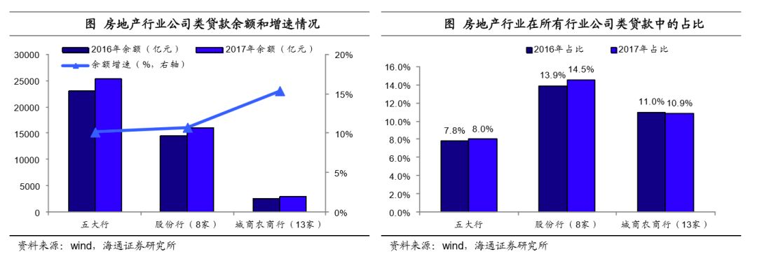 房地产行业贷款占比稳中略升。房地产行业占所有公司类贷款的比重上,五大行从2016年的7.8%小幅抬升至8.0%,股份行这一比例从2016年的13.9%上升到14.5%,而13家上市城商农商行这一比例从2016年的11%小幅降至10.9%。从行业贷款占比上看,17年房地产行业的贷款是较16年稳中有升的。