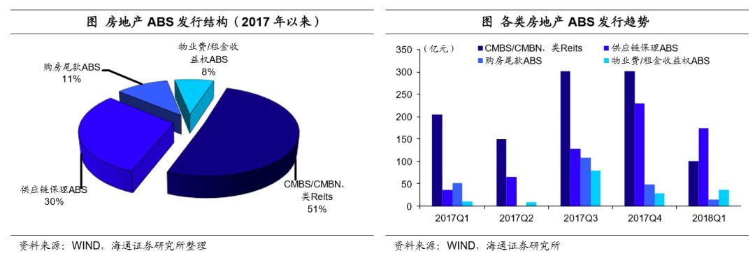 房地产供应链ABS发行量快速增加。17年房地产供应链ABS发行了458.7亿,占房地产ABS发行总额的26.2%,17年四季度以来发行量尤为突出,17年四季度房地产供应链ABS发行总额达230亿元,占比38%,环比增长179.7%。到18年一季度,房地产供应链ABS发行额为174.5亿元,成为当季供应量最大的房地产ABS品种。
