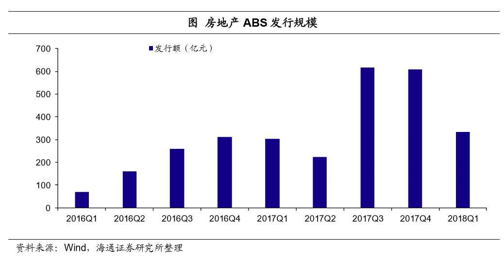 房地产ABS迎来爆发式发展。据我们的整理统计,17年房地产ABS产品发行总额约1751亿元,较16年增长了119%,三、四季度发行量占大头,合计有1225亿元,占全年发行量的七成。18年一季度房地产ABS发行量环比有所回落,发行总额为334.2亿元。