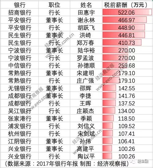 经济观察网记者对26家A股上市银行年报高管薪酬一栏统计发现,2017年银行业最高年薪被招行行长田惠宇以税前522.06万元斩获,平安银行董事长谢永林位列第二,为466.97万元。